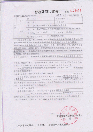 你公司聘用的驾驶员于2022年03月15日10时00分使用粤G41566重型特殊结构货车运载货物于中铁二局广汕铁路(GSSG-4标)搅拌站被我单位执法人员检查,经查,该车总重53.43吨,3轴车车货总重限重25.000吨,超限28.43吨,运载指标超过国家规定限值且未依法办理《超限运输车辆通行证》。货运源头单位为车辆超标准装载、配载事实清楚,有超限车辆稽查检测数据,询问笔录等证据为证。违反了《广东省道路货物运输源头超限超载治理办法》第七条第(一)项的规定,依据《广东省道路货物运输源头超限超载治理办法》第十二条、《广东省交通运输行政处罚裁量标准》的规定。决定给予罚款人民币贰万元整(20000)的行政处罚。我局通过直接送达、邮寄送达等方式无法送达《行政处罚决定书》,现依法向你公告送达《行政处罚决定书》【编号:惠博交罚〔2022〕00599号】,限你自公告之日起30日内到我局领取《行政处罚决定书》(中文博彩平台罗阳街道中文博彩平台大道中685号),逾期则视为送达。