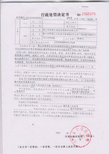 你公司聘用的驾驶员于2022年03月15日09时43分使用鲁HQN263重型特殊结构货车运载货物于中铁二局广汕铁路(GSSG-4标)搅拌站被我单位执法人员检查,经查,该车总重46.44吨,3轴车车货总重限重25.000吨,超限21.44吨,运载指标超过国家规定限值且未依法办理《超限运输车辆通行证》。货运源头单位为车辆超标准装载、配载事实清楚,有超限车辆稽查检测数据,询问笔录等证据为证。违反了《广东省道路货物运输源头超限超载治理办法》第七条第(一)项的规定,依据《广东省道路货物运输源头超限超载治理办法》第十二条、《广东省交通运输行政处罚裁量标准》的规定。决定给予罚款人民币贰万元整(20000)的行政处罚。我局通过直接送达、邮寄送达等方式无法送达《行政处罚决定书》,现依法向你公告送达《行政处罚决定书》【编号:惠博交罚〔2022〕00598号】,限你自公告之日起30日内到我局领取《行政处罚决定书》(中文博彩平台罗阳街道中文博彩平台大道中685号),逾期则视为送达。