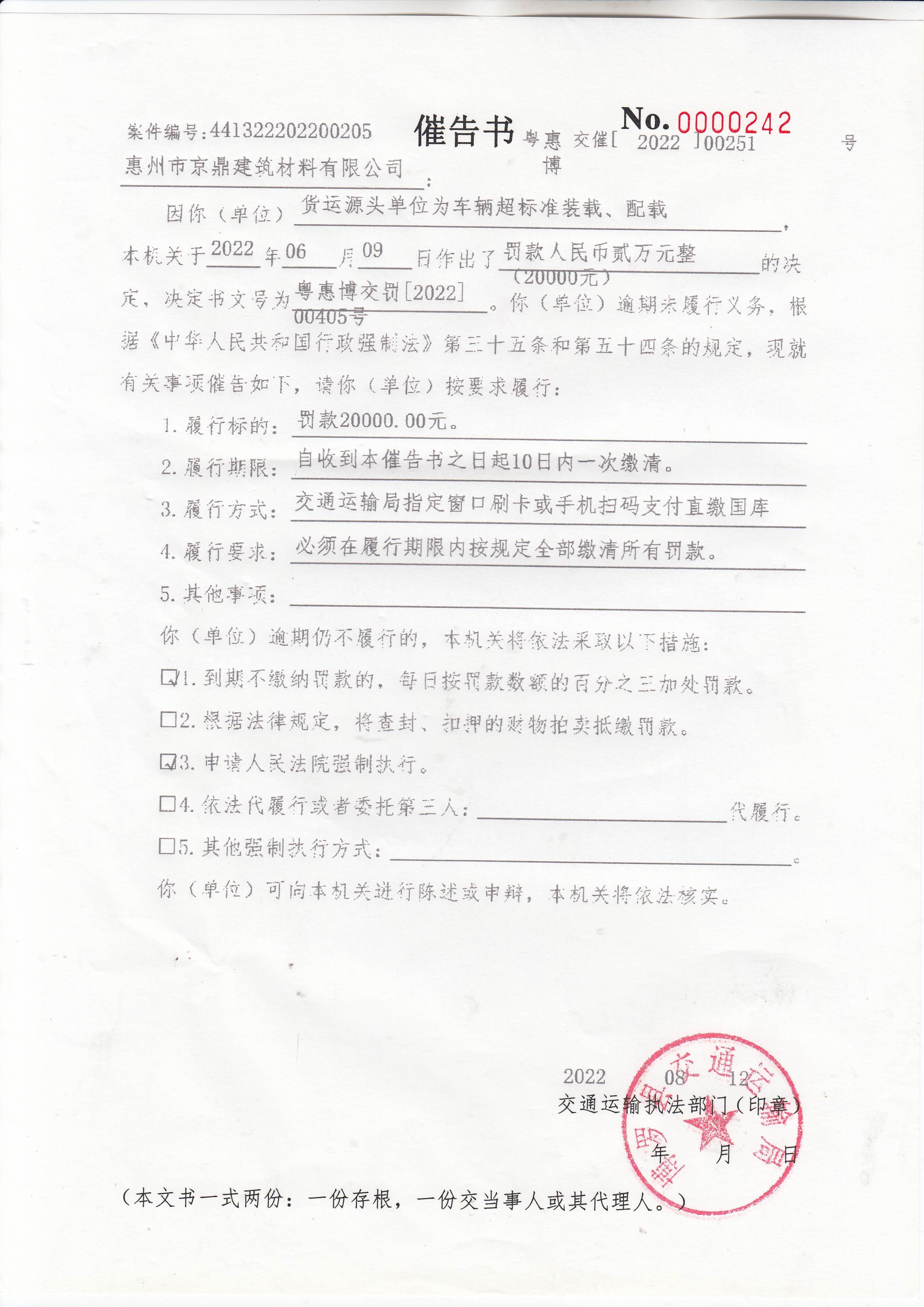 一、你公司为粤ABG565重型货车超标准装载、配载案,本机关于2022年06月09日作出了罚款人民币贰万元整(20000元)的决定,决定书文号为:惠博交罚[2022]00405号,但你公司在本机关决定的期限内不履行义务。