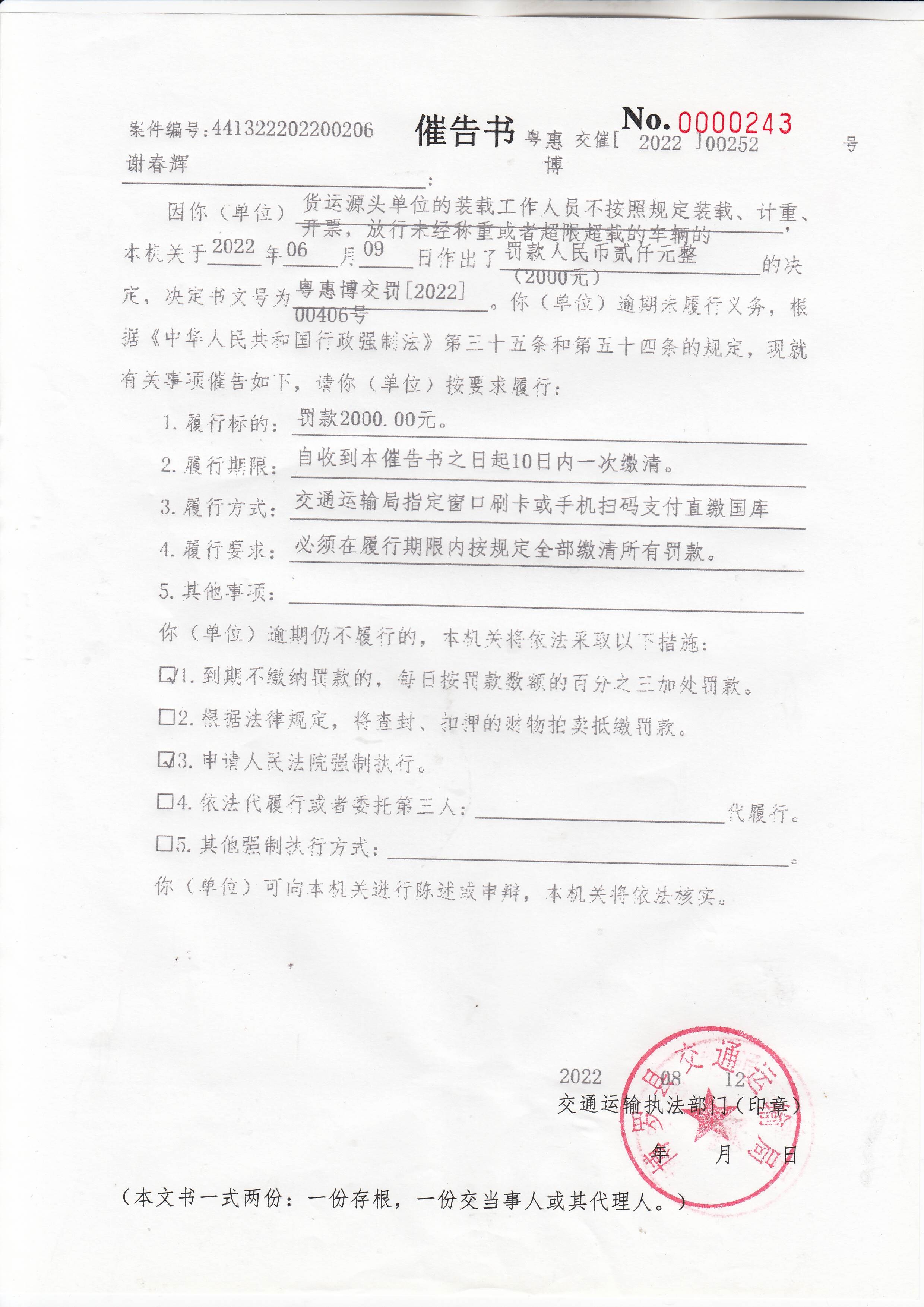 一、惠州市京鼎建筑材料有限公司装载负责人谢春辉不按照规定放行未经称重的超限超载车辆案,本机关于2022年06月09日作出了罚款人民币贰仟元整(2000元)的决定,决定书文号为:惠博交罚[2022]00406号),但你在本机关决定的期限内不履行义务。