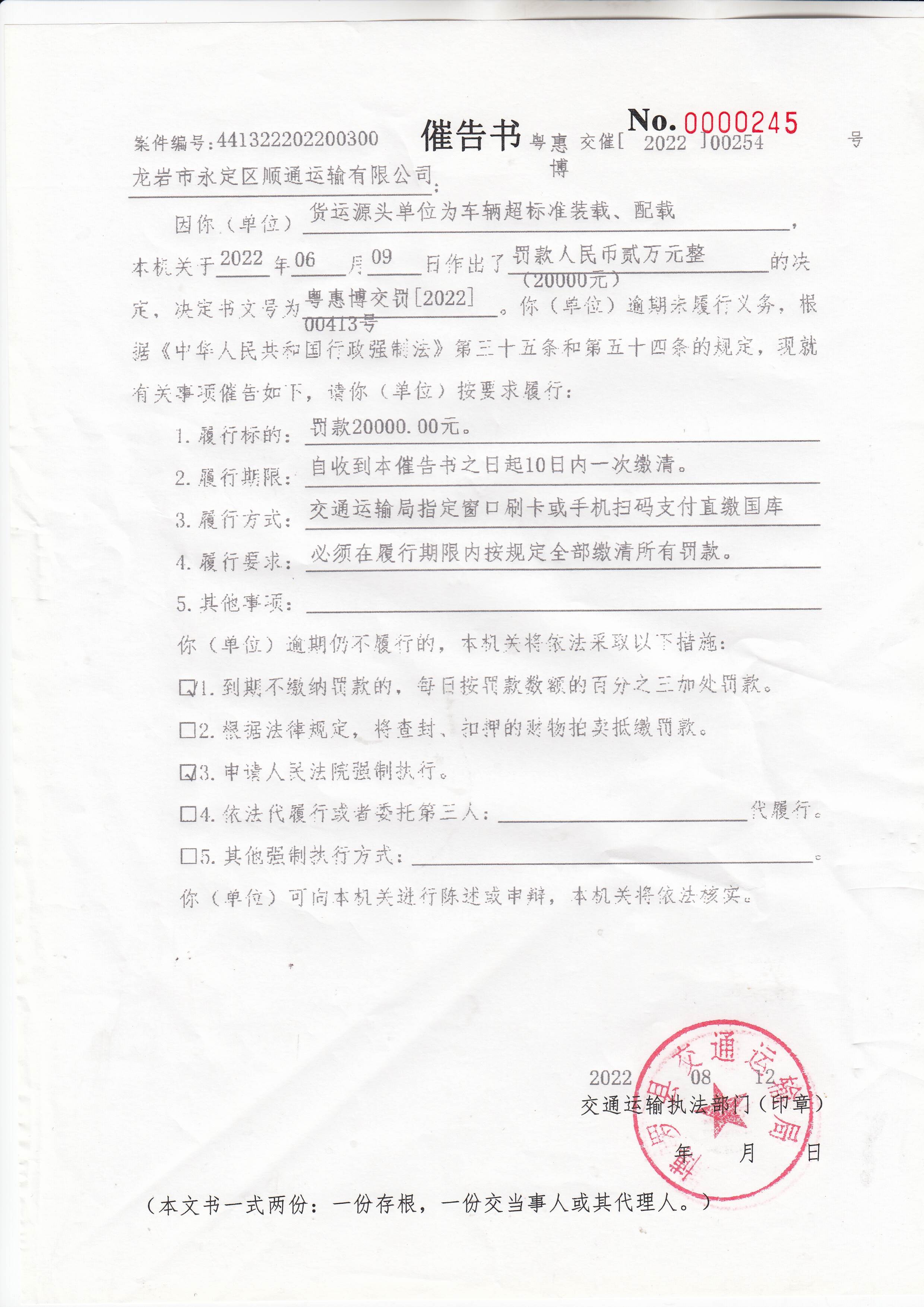 一、你公司货运源头单位涉嫌为车辆超标准装载、配载一案,本机关于2022年06月09日作出了罚款人民币贰万元整(20000元)的决定,决定书文号为:惠博交罚[2022]00413号),但你公司在本机关决定的期限内不履行义务。