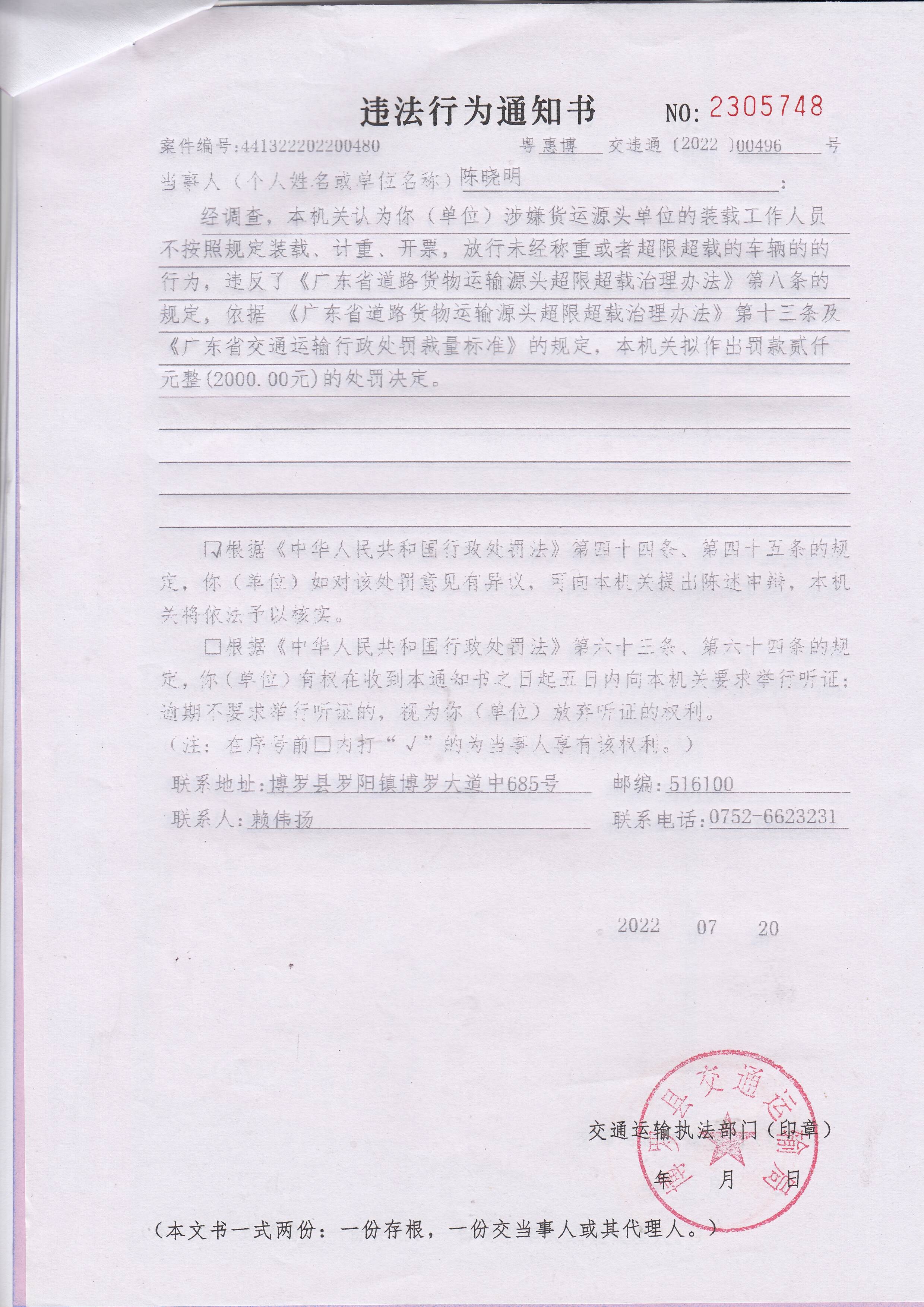 经调查,本机关认为你(单位)涉嫌货运源头单位的装载工作人员不按照规定装载、计重、开票,放行未经称重或者超限超载的车辆的行为,违反了《广东省道路货物运输源头超限超载治理办法》第八条的规定,依据 《广东省道路货物运输源头超限超载治理办法》第十三条及《广东省交通运输行政处罚裁量标准》的规定,本机关拟作出罚款贰仟元整(2000.00元)的处罚决定。因其他法定方式无法送达,现依法向你单位公告送达《违法行为通知书》(惠博交字【2022】00496号),自公告之日起30日内来我局(中文博彩平台罗阳街道办事处中文博彩平台大道中685号)签收,逾期视为送达。
