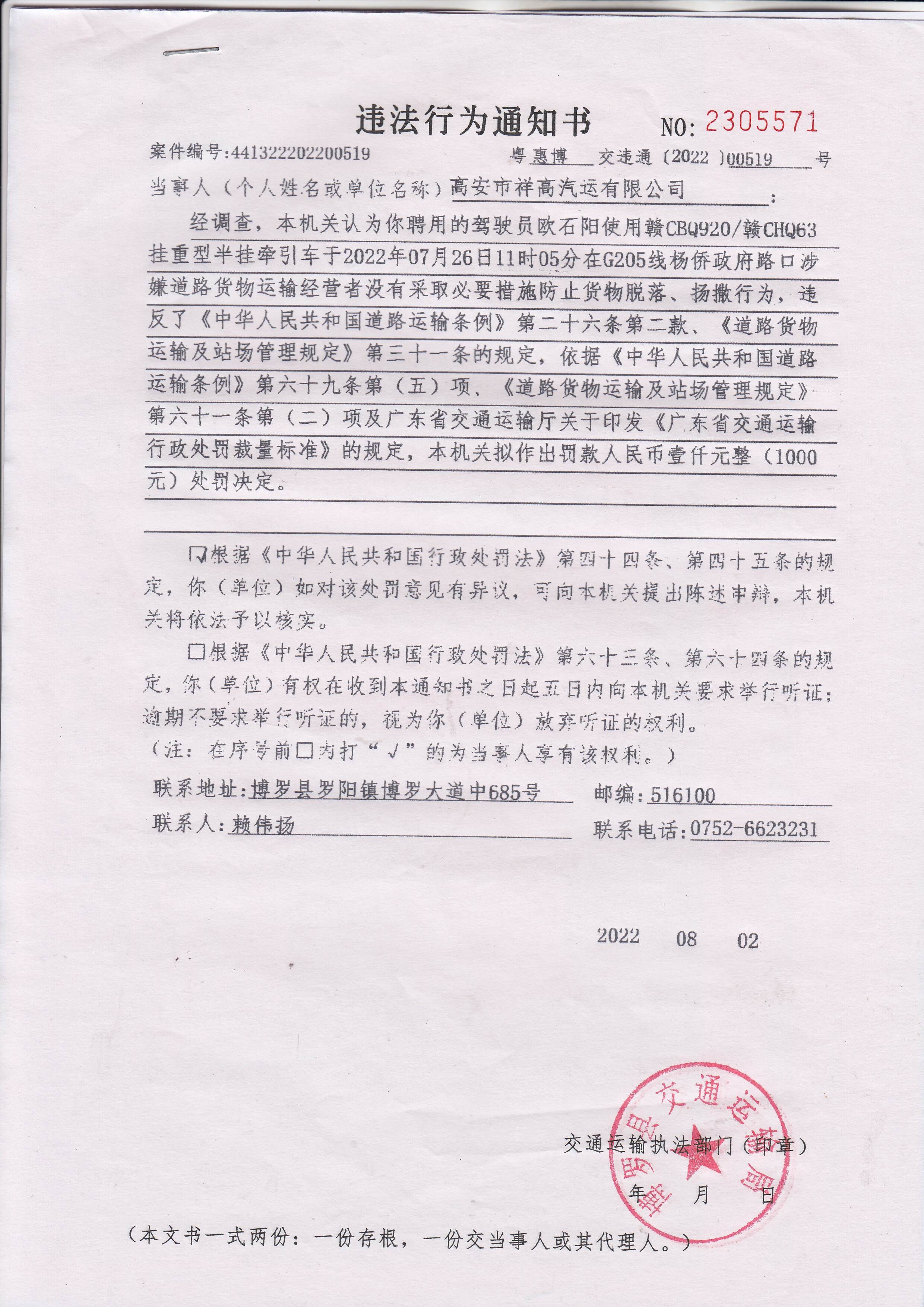 经调查,本机关认为你聘用的驾驶员欧石阳使用赣CBQ920/赣CHQ63挂重型半挂牵引车于2022年07月26日11时05分在G205线杨侨政府路口涉嫌道路货物运输经营者没有采取必要措施防止货物脱落、扬撒行为,违反了《中华人民共和国道路运输条例》第二十六条第二款、《道路货物运输及站场管理规定》第三十一条的规定,依据《中华人民共和国道路运输条例》第六十九条第(五)项、《道路货物运输及站场管理规定》第六十一条第(二)项及广东省交通运输厅关于印发《广东省交通运输行政处罚裁量标准》的规定,本机关拟作出罚款人民币壹仟元整(1000元)处罚决定。因其他法定方式无法送达,现依法向你单位公告送达《违法行为通知书》(惠博交字【2022】00519号),自公告之日起30日内来我局(中文博彩平台罗阳街道办事处中文博彩平台大道中685号)签收,逾期视为送达。