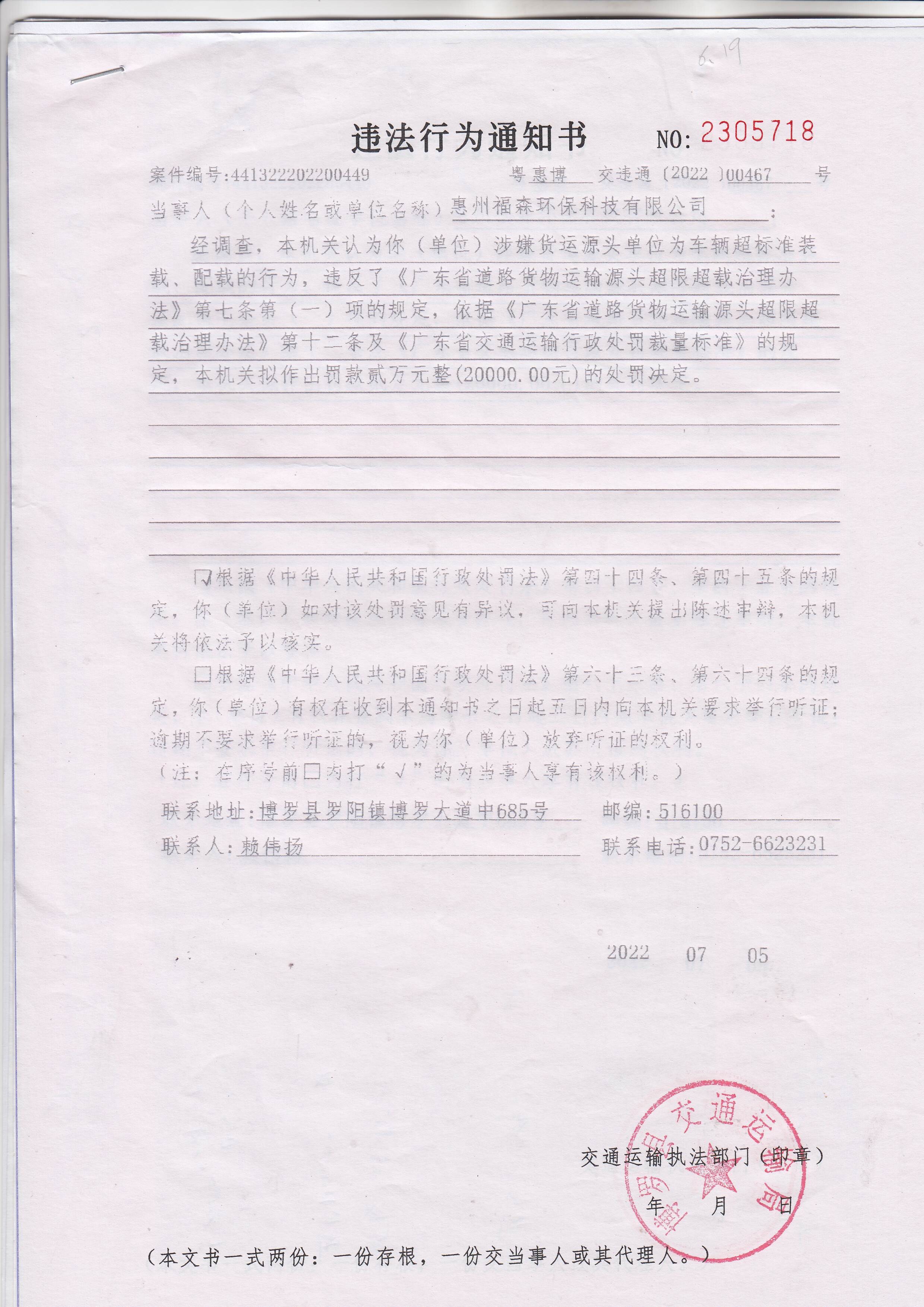 经调查,本机关认为你(单位)涉嫌货运源头单位为车辆超标准装载、配载的行为,违反了《广东省道路货物运输源头超限超载治理办法》第七条第(一)项的规定,依据《广东省道路货物运输源头超限超载治理办法》第十二条及《广东省交通运输行政处罚裁量标准》的规定,本机关拟作出罚款贰万元整(20000.00元)的处罚决定。因其他法定方式无法送达,现依法向你单位公告送达《违法行为通知书》(惠博交字【222】00467号),自公告之日起30日内来我局(中文博彩平台罗阳街道办事处中文博彩平台大道中685号)签收,逾期视为送达。