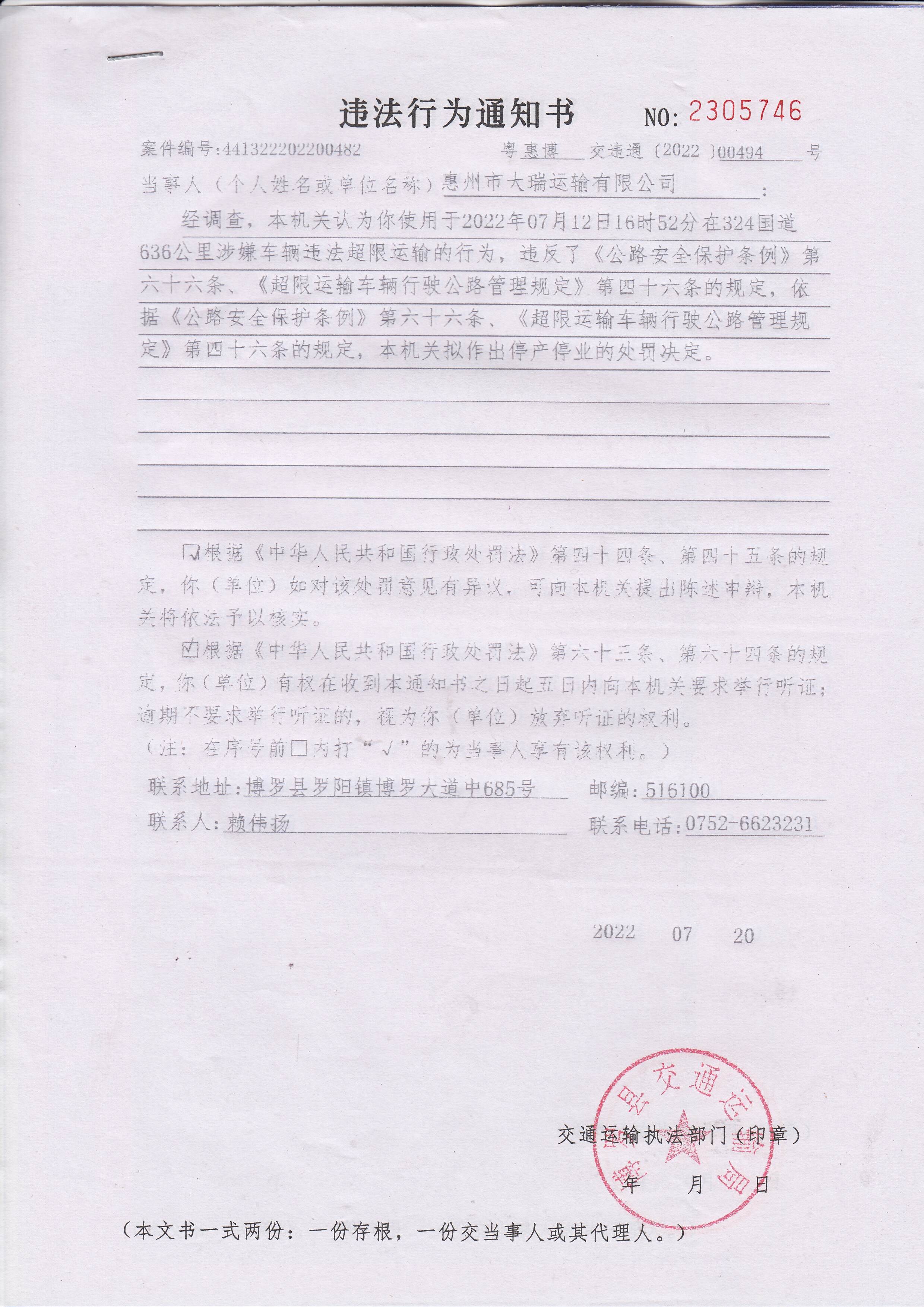 经调查,本机关认为你使用于2022年07月12日16时52分在324国道636公里涉嫌车辆违法超限运输的行为,违反了《公路安全保护条例》第六十六条、《超限运输车辆行驶公路管理规定》第四十六条的规定,依据《公路安全保护条例》第六十六条、《超限运输车辆行驶公路管理规定》第四十六条的规定,本机关拟作出停产停业的处罚决定。因其他法定方式无法送达,现依法向你单位公告送达《违法行为通知书》(惠博交字【2022】00494号),自公告之日起30日内来我局(中文博彩平台罗阳街道办事处中文博彩平台大道中685号)签收,逾期视为送达。