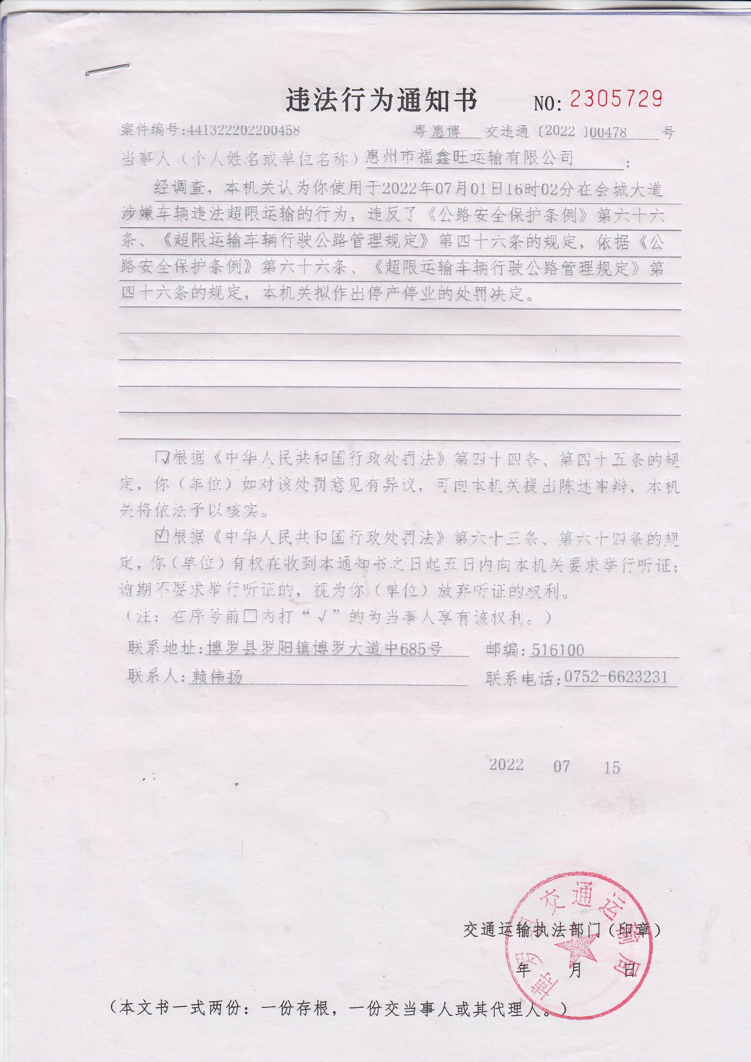 经调查,本机关认为你使用于2022年07月01日16时02分在会城大道涉嫌车辆违法超限运输的行为,违反了《公路安全保护条例》第六十六条、《超限运输车辆行驶公路管理规定》第四十六条的规定,依据《公路安全保护条例》第六十六条、《超限运输车辆行驶公路管理规定》第四十六条的规定,本机关拟作出停产停业的处罚决定。因其他法定方式无法送达,现依法向你单位公告送达《违法行为通知书》(惠博交字【2022】00478号),自公告之日起30日内来我局(中文博彩平台罗阳街道办事处中文博彩平台大道中685号)签收,逾期视为送达。