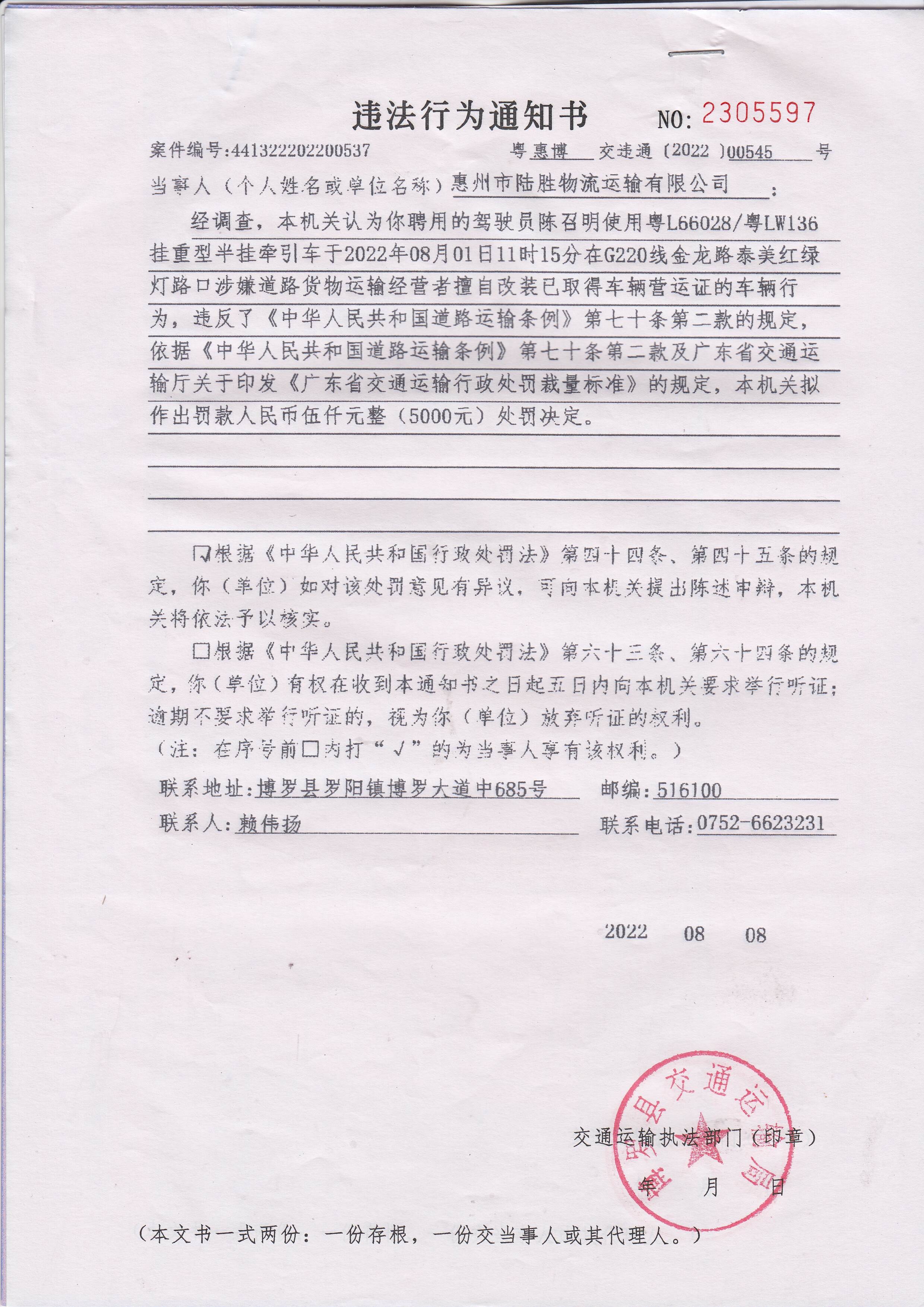 经调查,本机关认为你聘用的驾驶员陈召明使用粤L66028/粤LW136挂重型半挂牵引车于2022年08月01日11时15分在G220线金龙路泰美红绿灯路口涉嫌道路货物运输经营者擅自改装已取得车辆营运证的车辆行为,违反了《中华人民共和国道路运输条例》第七十条第二款的规定,依据《中华人民共和国道路运输条例》第七十条第二款及广东省交通运输厅关于印发《广东省交通运输行政处罚裁量标准》的规定,本机关拟作出罚款人民币伍仟元整(5000元)处罚决定。因其他法定方式无法送达,现依法向你单位公告送达《违法行为通知书》(惠博交字【2022】00545号),自公告之日起30日内来我局(中文博彩平台罗阳街道办事处中文博彩平台大道中685号)签收,逾期视为送达。