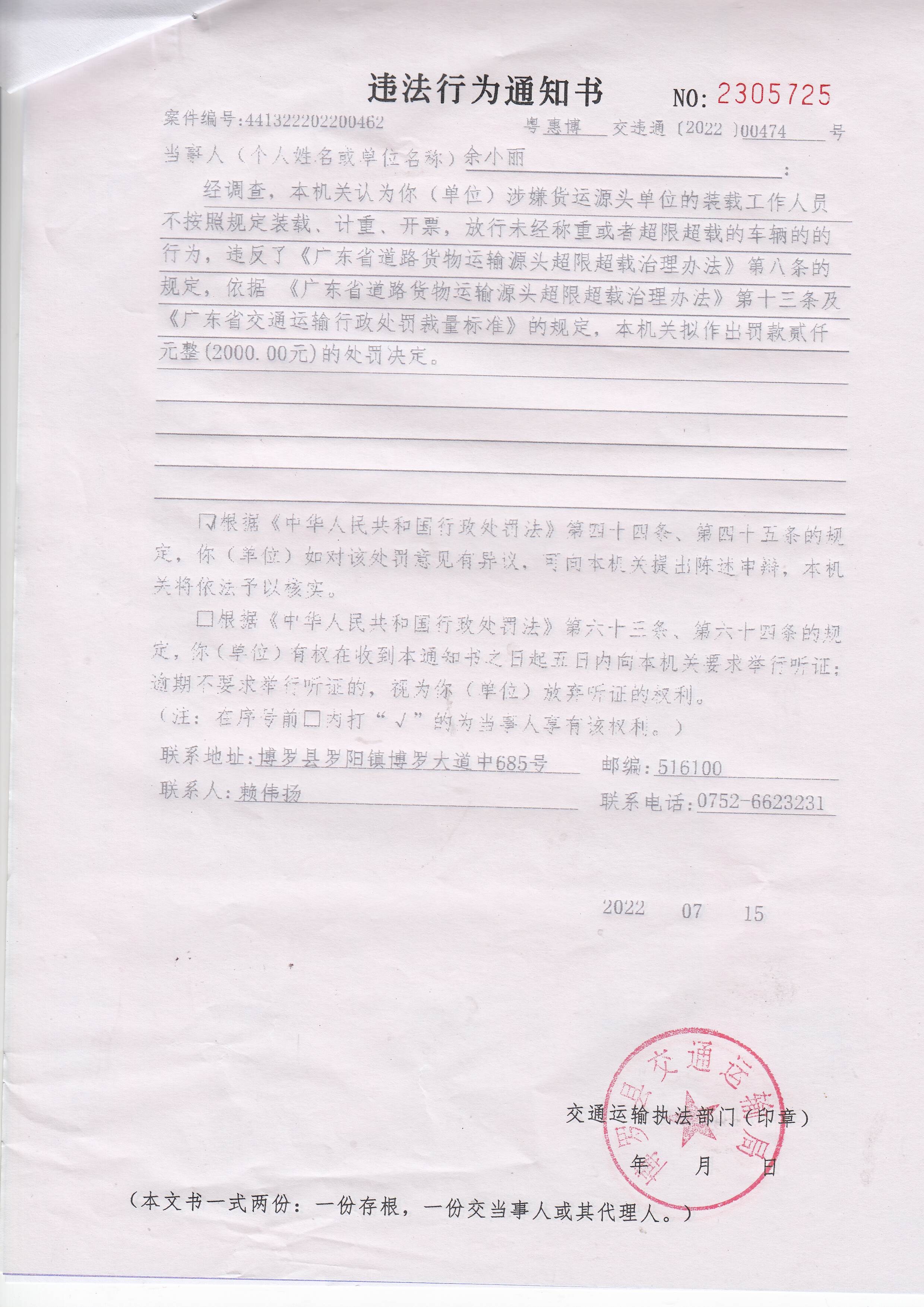 经调查,本机关认为你(单位)涉嫌货运源头单位的装载工作人员不按照规定装载、计重、开票,放行未经称重或者超限超载的车辆的行为,违反了《广东省道路货物运输源头超限超载治理办法》第八条的规定,依据 《广东省道路货物运输源头超限超载治理办法》第十三条及《广东省交通运输行政处罚裁量标准》的规定,本机关拟作出罚款贰仟元整(2000.00元)的处罚决定。因其他法定方式无法送达,现依法向你单位公告送达《违法行为通知书》(惠博交字【2022】00474号),自公告之日起30日内来我局(中文博彩平台罗阳街道办事处中文博彩平台大道中685号)签收,逾期视为送达。