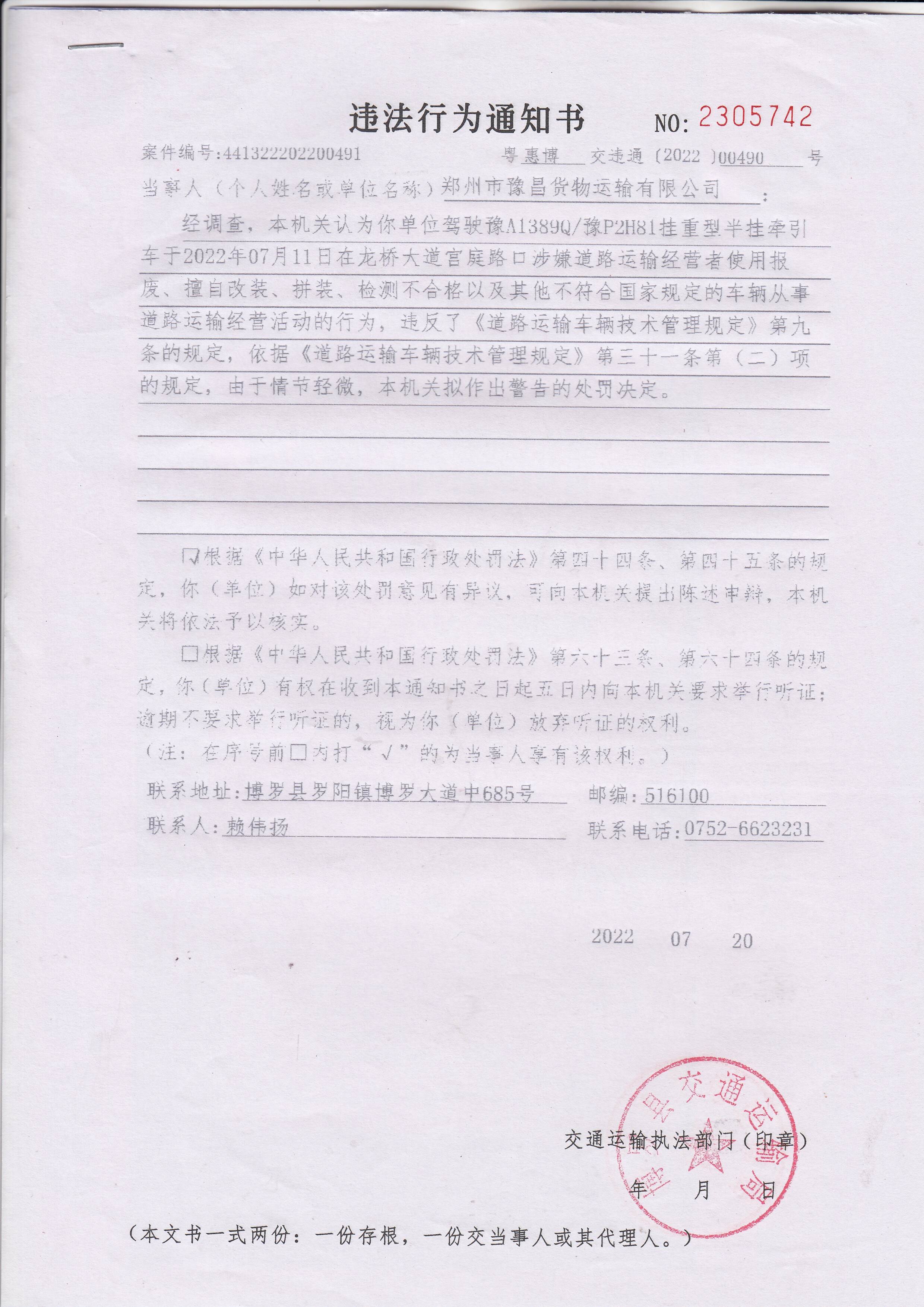 经调查,本机关认为你单位驾驶豫A1389Q/豫P2H81挂重型半挂牵引车于2022年07月11日在龙桥大道宫庭路口涉嫌道路运输经营者使用报废、擅自改装、拼装、检测不合格以及其他不符合国家规定的车辆从事道路运输经营活动的行为,违反了《道路运输车辆技术管理规定》第九条的规定,依据《道路运输车辆技术管理规定》第三十一条第(二)项的规定,由于情节轻微,本机关拟作出警告的处罚决定。因其他法定方式无法送达,现依法向你单位公告送达《违法行为通知书》(惠博交字【2022】00491号),自公告之日起30日内来我局(中文博彩平台罗阳街道办事处中文博彩平台大道中685号)签收,逾期视为送达。