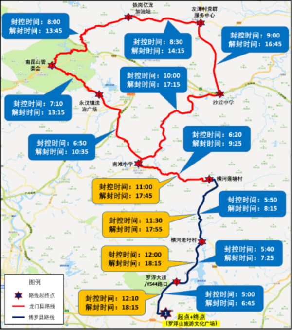 5:00-6:45,对罗浮大道(罗浮山风景名胜区旅游文化广场至Y544路口段)进行临时交通管制;