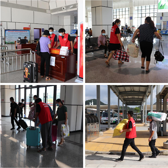 志愿者们在县城中心客运站候车亭(室)、进出站口、安检口、售票处及县城客流量较多的6个公交点等容易发生乘客拥堵的地方引导乘客文明候车,按次序上下车和进出站,劝离街道、路口的违停车辆,积极维护交通秩序,避免发生拥堵,确保通道畅通;同时向乘客宣传文明乘车理念,提醒乘客注意安全,耐心为旅客提供咨询服务,主动帮助乘客搬运行李。