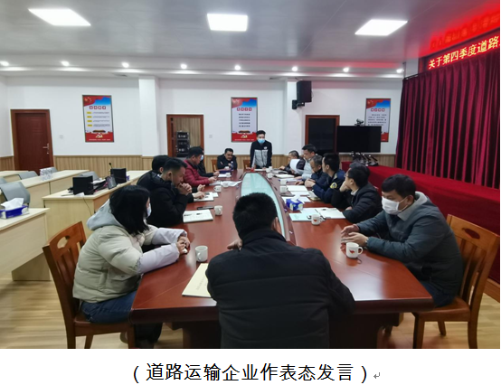 最后,运输股廖旭辉股长对这8家道路运输企业提出如下要求:一是思想上要重视,各运输企业须提高企业驾驶员的交通安全意识,筑牢预防重大交通事故的第一道防线;二是行动上要落实,各运输企业要深入贯彻落实会议精神,树立“隐患就是事故”的理念,彻底根除道路安全隐患。8家道路运输企业也就这次会议作了表态,他们表示在今后的工作中要加强驾驶员的安全教育培训,增强他们的安全生产意识,努力做到不超速,杜绝交通安全事故的发生。