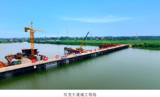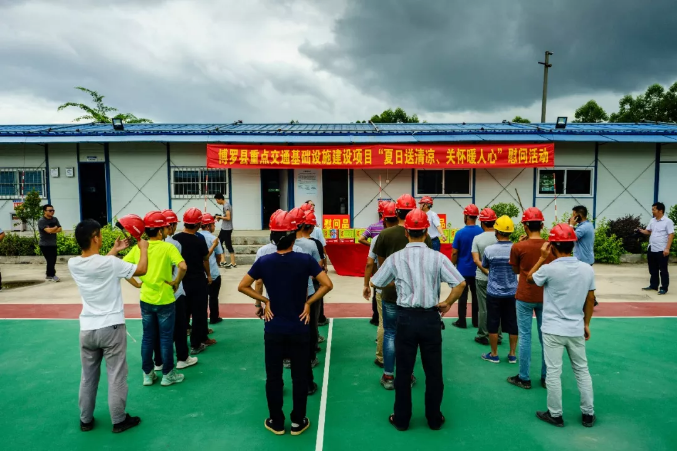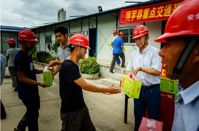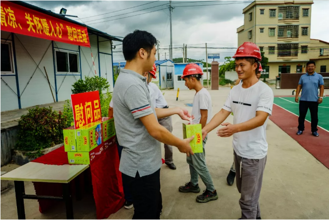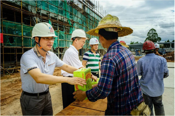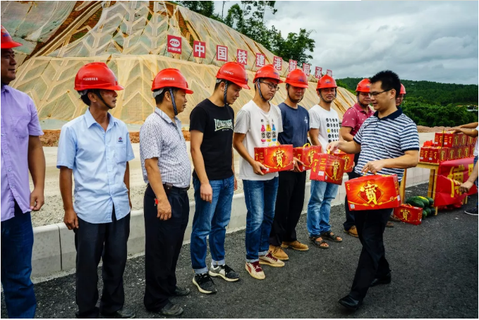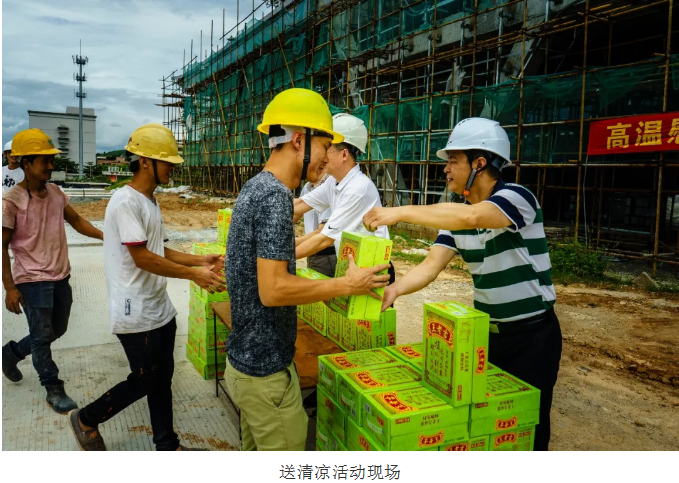 夏日送清凉、关怀暖人心,中铁建港航局项目公司负责人为双龙大道一线工人送上消暑饮品。