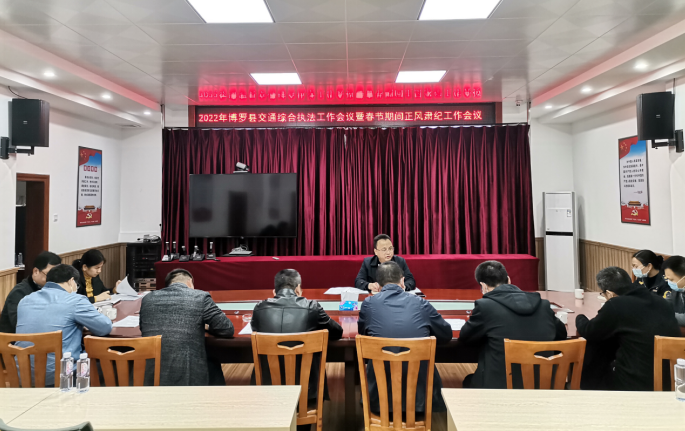 2022年1月17日下午,县交通运输局在一楼视频会议室召开交通综合执法工作会议暨春节期间正风肃纪工作会议,县交通运输局党组成员、直属机关专职副书记邹洪亮主持会议,法规股、治超办负责人,各执法队正副队长参加会议。