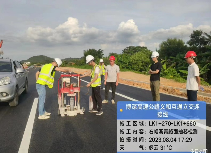 2023年8月4日下午,规建中心工作人员协同第三方检测单位到博深高速公路义和互通立交连接线工程抽检路面工程质量。