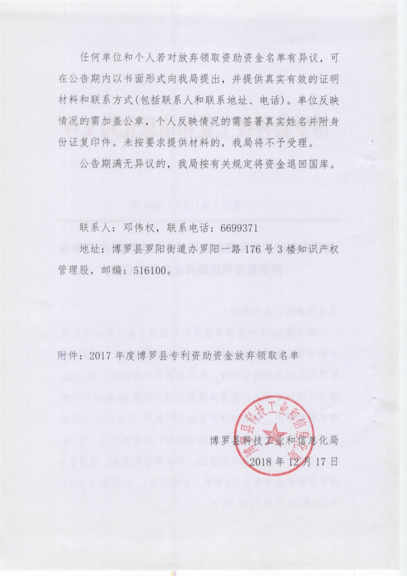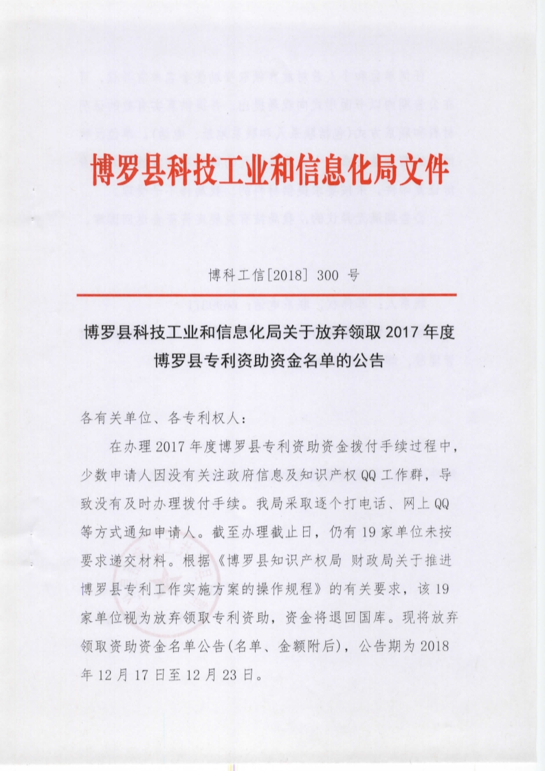 中文博彩平台科技工业和信息化局关于放弃2017年度中文博彩平台专利资助资金名单的公告