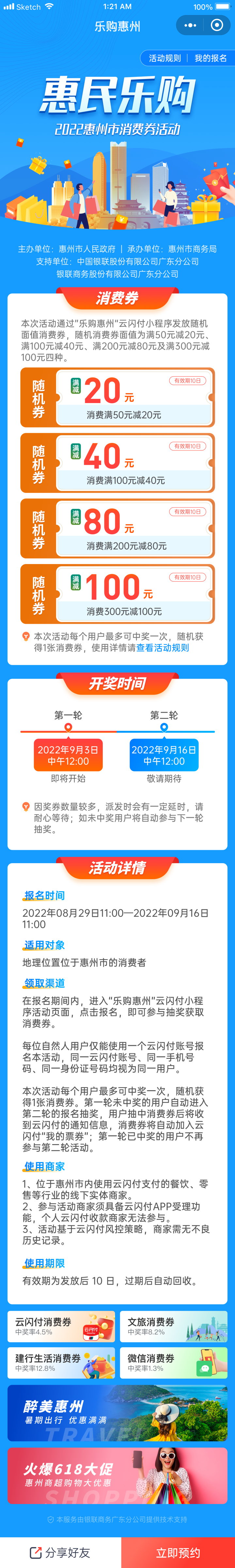 2022年8月29日上午11:00起开放预约报名,报名“惠州消费券”的操作路径如下: