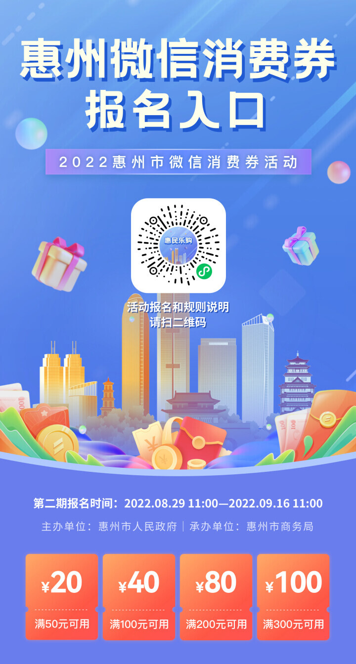为持续扩大内需、促进消费回暖,进一步激发消费活力、刺激消费增长,让市民得实惠、让企业得实利,2022年惠州市“惠民乐购”第二期消费券活动将于2022年8月29日至9月26日在全市展开。我县大力发动商家企业资源,共同推出折扣、满减、赠券等企业优惠,共同赋能、让利于民,吸引更多消费者参与,提振消费市场信心。具体时间为8月29日起预约报名,9月3日第一轮开奖,9月16日第二轮开奖。
