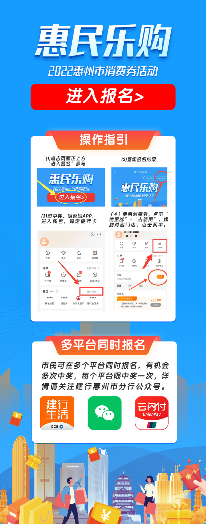 ③建行生活APP:消费者到消费券适用的商家线下门店消费,满足消费券满减条件,登录建行生活APP并开通钱包、绑定银行卡后,使用建行生活APP支付直接抵扣消费券。