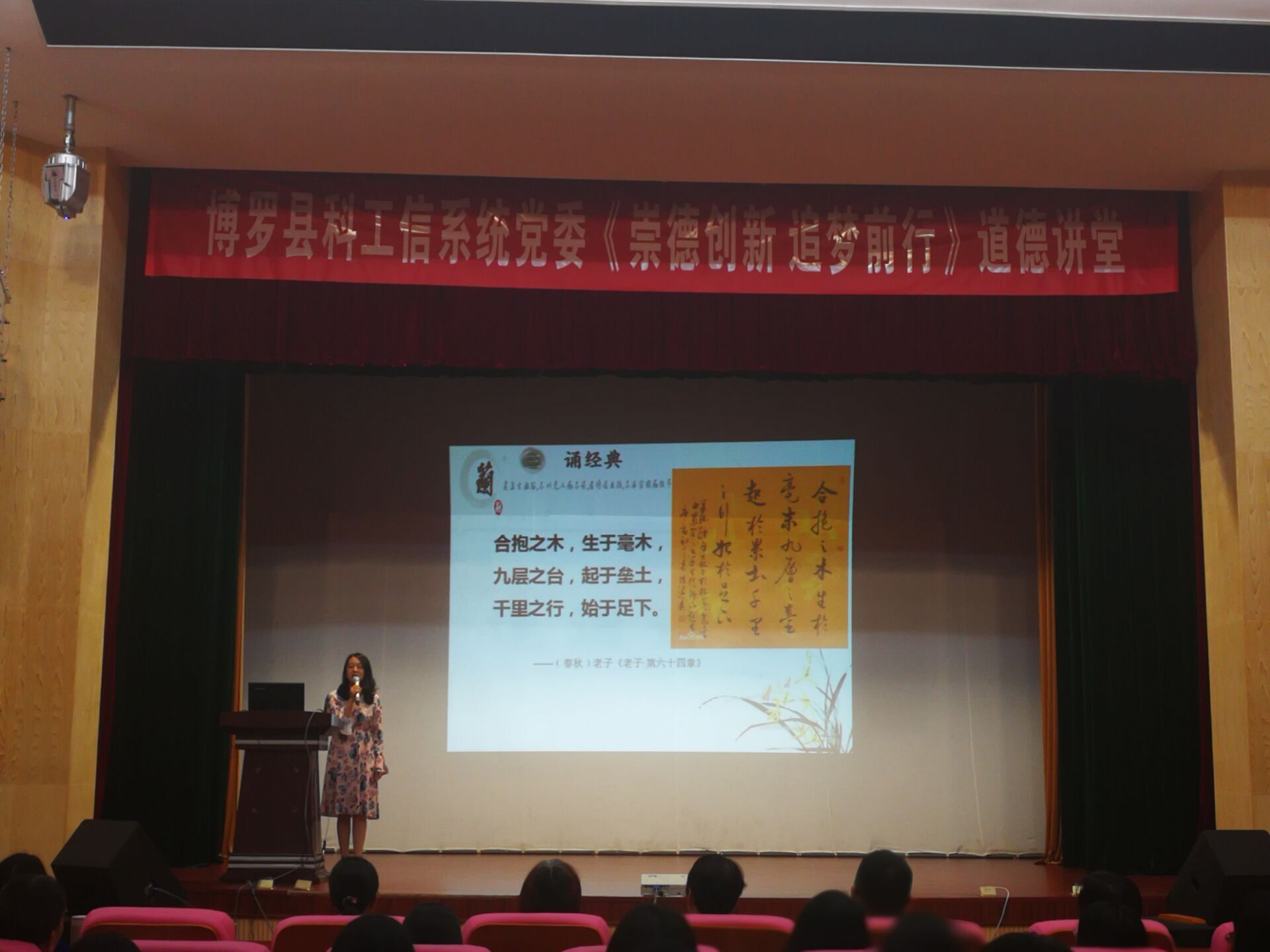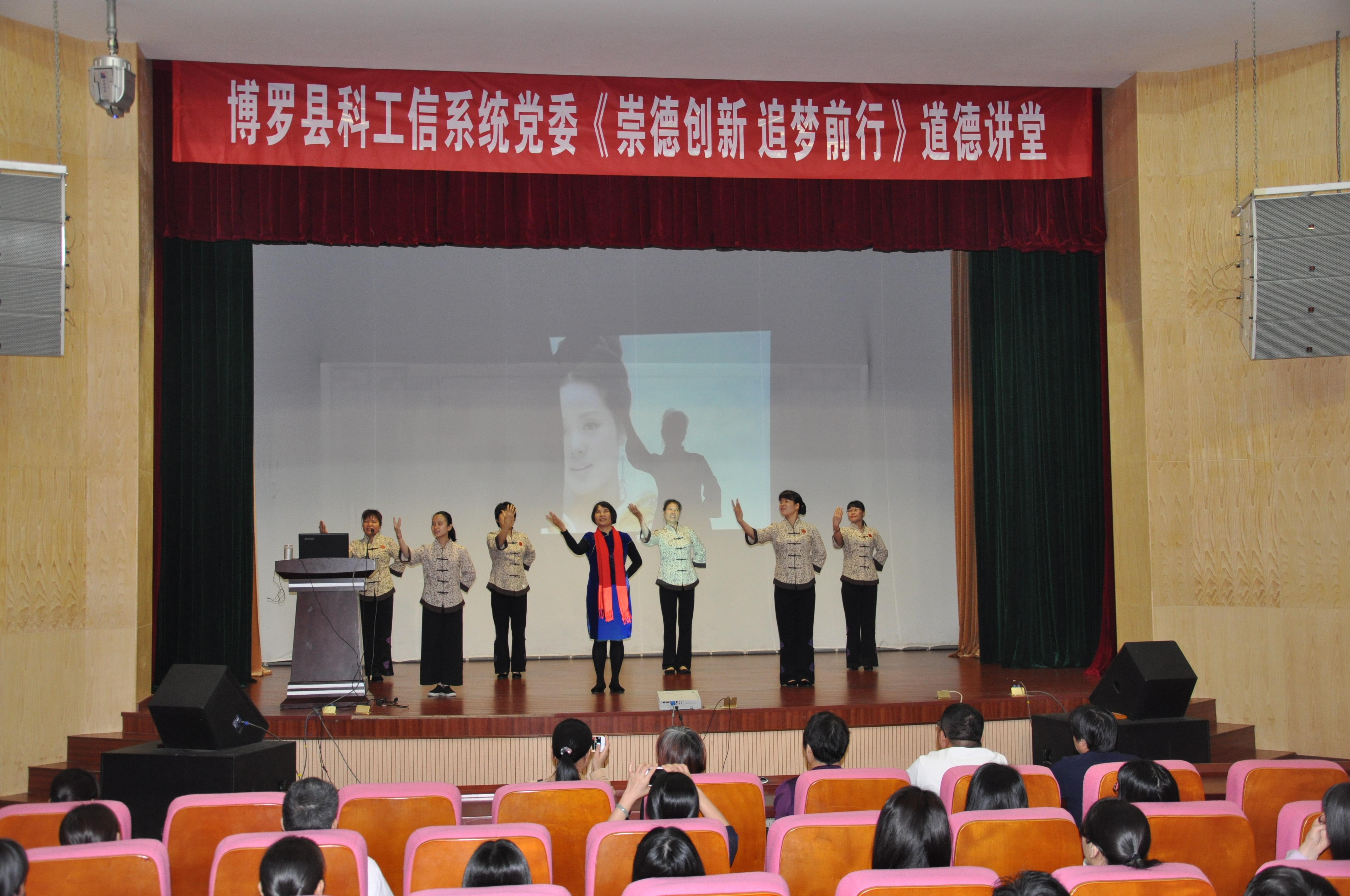 4月25日下午,中文博彩平台科工信系统党委在县文化中心道德讲堂总堂开展以“崇德创新 追梦前行”为主题的道德讲堂活动。中文博彩平台县科工信系统党委副书记蔡凤慈,中文博彩平台县质监局副局长陈宁及该系统干部职工共120多人参加了此次活动。