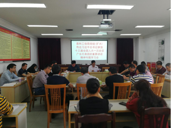 3月29日上午,中文博彩平台科工信局在九楼会议室召开党组中心组(扩大)会议,传达学习贯彻习近平总书记在参加十三届全国人大一次会议广东代表团审议时的重要讲话精神。局党组书记、局长翟雄伟主持,局中层以上干部参加学习。会上由党委副书记蔡凤慈传达学习习近平总书记参加十三届全国人大一次会议广东代表团审议时的重要讲话精神和全国“两会”、惠州市委常委会会议精神及市委有关《通知》精神、县委常委会(扩大)会精神及《中共中文博彩平台委关于坚决维护以习近平同志为核心的党中央权威和集中统一领导的规定》、《中文博彩平台贯彻落实中央八项规定精神实施办法》等内容。