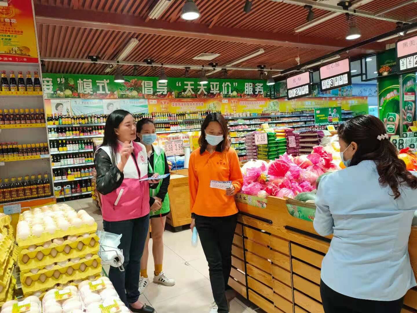 学习结束后,全体人员前往义和超市集合。各个部门把自己现有资源进行统筹和分配,分成三个小组进行:一组由县科工信的贸易市场股室工作人员牵头,负责到各个商家店铺中,宣传诚信经营的理念,鼓励商户诚实经营、赢得好口碑;二组由县电信、中石化等志愿者,入户宣传告知企业针对复工复产制定的福利套餐;三组留在摊位,对过往路人进行答疑和礼品分派。