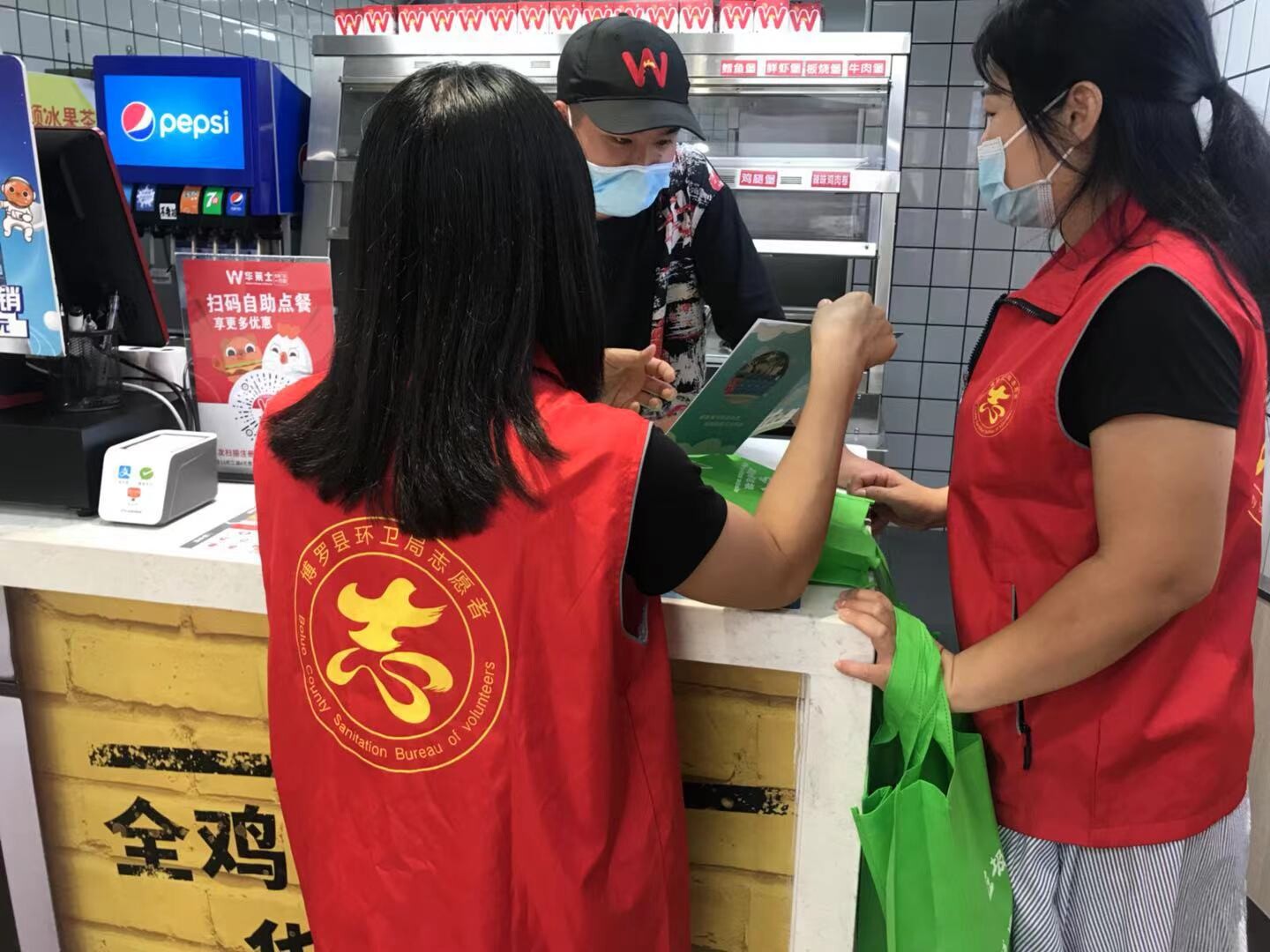 另一组工作人员抵达周边商户,通过分发垃圾分类宣传资料与讲解垃圾分类知识相结合的方式,帮助商户了解到更多垃圾分类知识,推动“绿色、低碳、环保”的理念深入经营理念中。