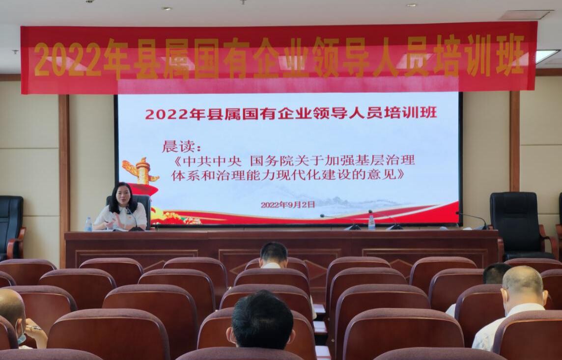 8月29日至9月2日,2022年县属国有企业领导人员培训班圆满结束。本次培训班主要围绕国有企业党的建设、国有企业高质量发展、基层治理和乡村振兴等方面,采取“晨读、午读”、专题授课、学员论坛等形式进行培训,旨在进一步提升国企领导人员综合素质和履职能力,帮助国企领导人员开阔眼界、增强本领,推动县管国有企业实现新发展。