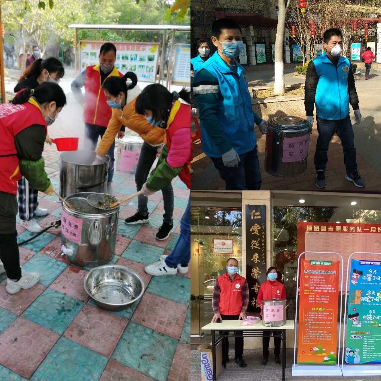 志愿者协会在这些日子里从未松懈过,他们以自己的实际行动积极投身到疫情防控工作当中,活跃在各个战“疫”岗位,义务当起宣传员、排查员、服务员,凝聚志愿服务力量助力疫情防控,为打赢疫情防控阻击战贡献志愿力量。县志愿服务联合会、博益志愿者协会、县博艾志愿者协会等纷纷为市民提供防流感凉茶10万多份。共同筑牢疫情防控的铜墙铁壁。2月6日,福田镇30多名志愿者积极投身战“疫”,分别到坳岭、山下、横溪头、周袁等村的疫情防控服务点,对来往车辆登记及群众测量体温、给村民发放倡议书、免费派发口罩等;星星公益协会开展1月27起,在县城浪头村、四季花城小区、和兴家园等小区为居民免费派送居民派送防流感凉茶和口罩,提醒村民及居民做好疫情预防措施,免费为市民派发口罩2450个,2月5日,星星公益协会联合县卫博病媒生物卫生消杀中心开展“防疫联控行动志愿服务活动”。