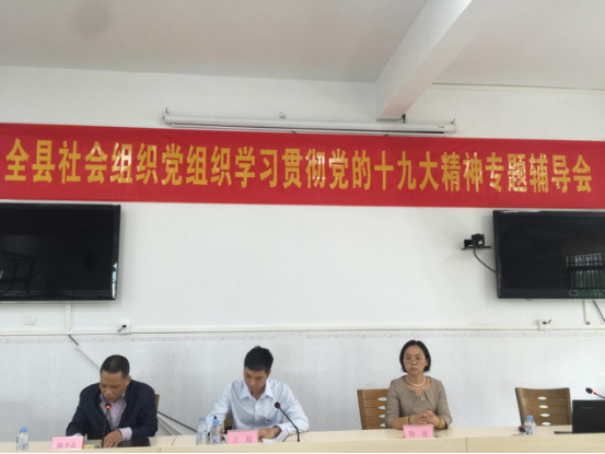 2017年11月7日下午,全县社会组织党组织学习贯彻党的十九大精神专题辅导会在县救助站3楼会议室召开。县两新组织党工委书记王超,县委党校副校长徐进,县民政局副局长、县社会组织党委书记陈小志,全县社会组织党支部书记及党务工作者共60人参加会议。
