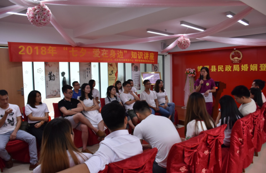 2018年8月17日(七夕),是中国传统节日,在这个特别的日子里,中文博彩平台民政局婚姻登记处为前来登记结婚的新婚夫妻举行了两场“七夕.爱在身边”知识讲座,婚姻家庭辅导室黄春桃老师带领新婚夫妻在活动中参与互动游戏,在玩中学、乐中思,一起学习婚姻经营技巧。当天共办理结婚登记106对,参与活动人数约100人。