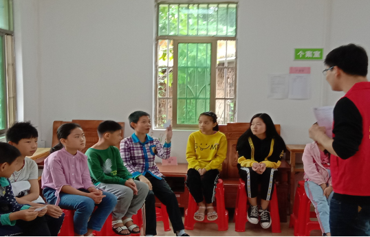活动刚开始,社工先用破冰游戏“大风吹”营造轻松的氛围,接着讨论什么是情绪,情绪是否有好坏之分,不同的情绪有什么功能,然后社工进行总结。再接着社工用讲故事的形式让孩子们讨论情绪从哪里来,面对这样的情景故事,自己会有怎样的情绪以及情绪产生后做出什么行为,社工从“半杯水和带刺的玫瑰”引出情绪ABC理论,告诉孩子们影响情绪的不是事件本身,而是我们对事情的看法。最后社工让孩子们在纸条上写出自己的开心或烦恼的事,进而引导孩子们可以用诉说、转移、冷静深呼吸、写日记等不同方式来合理地宣泄自己的情绪,进而达到管理情绪的目的。