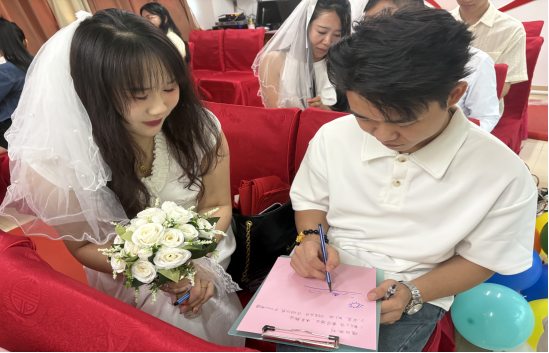 “手作书签,系住‘一生之约’”环节中,新人协作完成专属信物:写下“吵架时也不松开你的手”等承诺,绘制“碰手背”等默契小景,系上象征“牵缘系情”的红绳缘结。有新娘提及首次收到的手镯礼物时,与丈夫相拥落泪,温情瞬间打动全场。