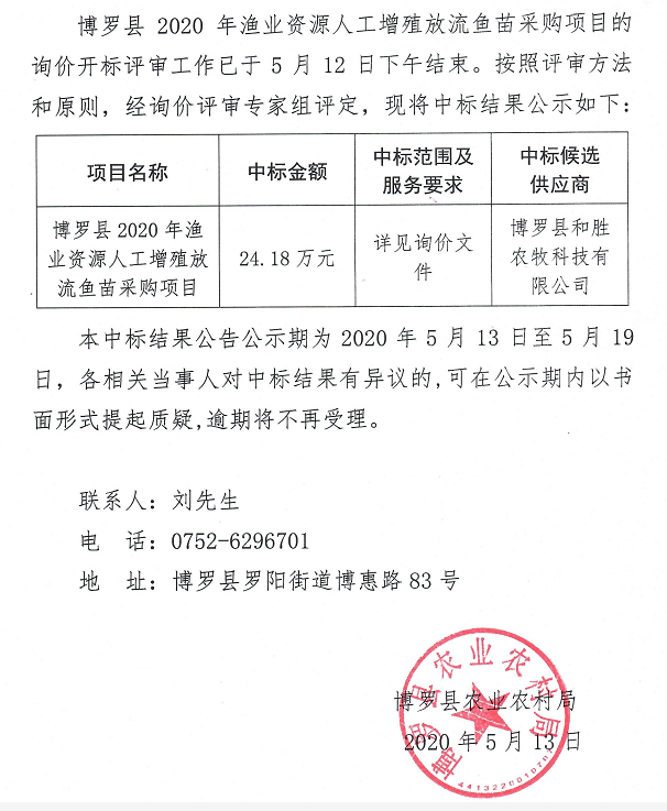 中文博彩平台2020年渔业资源人工增殖放流鱼苗采购项目询价评审结果公示