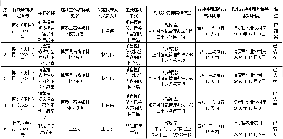 中文博彩平台农业农村局2020年农业行政处罚案件信息公开表