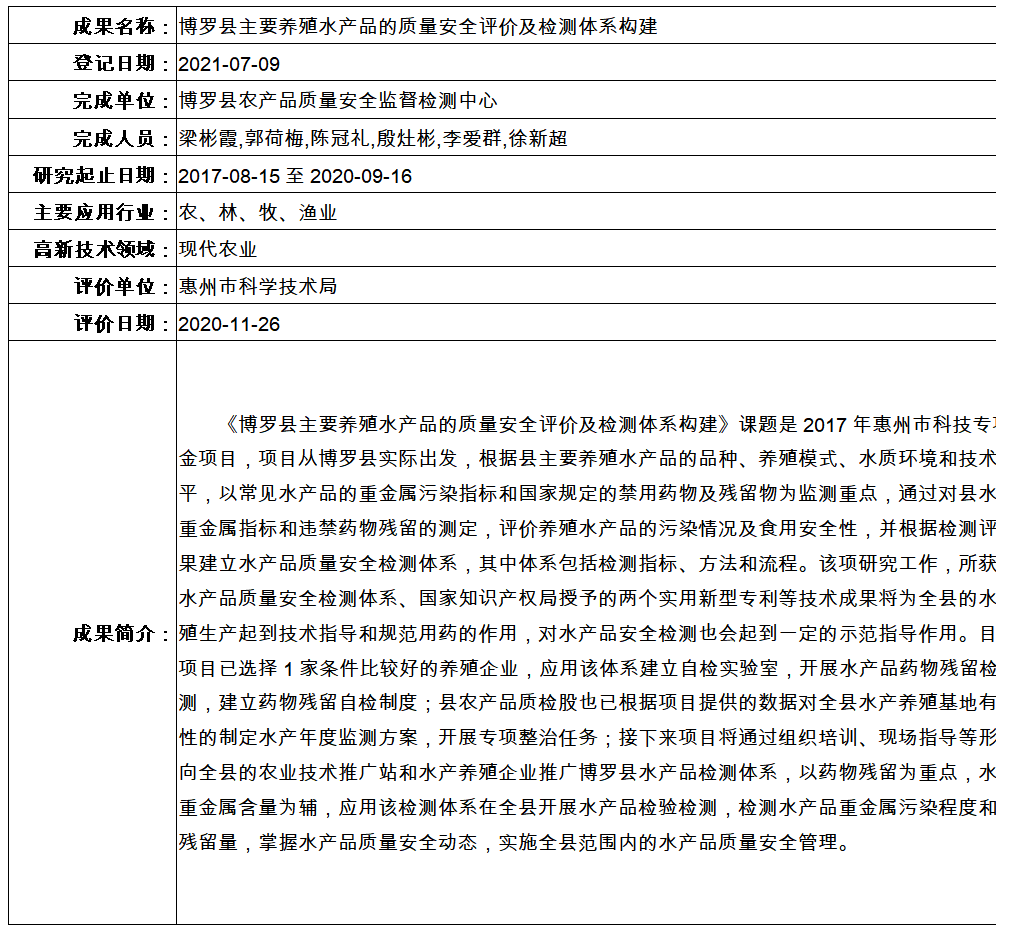 科技成果公示--中文博彩平台主要养殖水产品的质量安全评价及检测体系构建