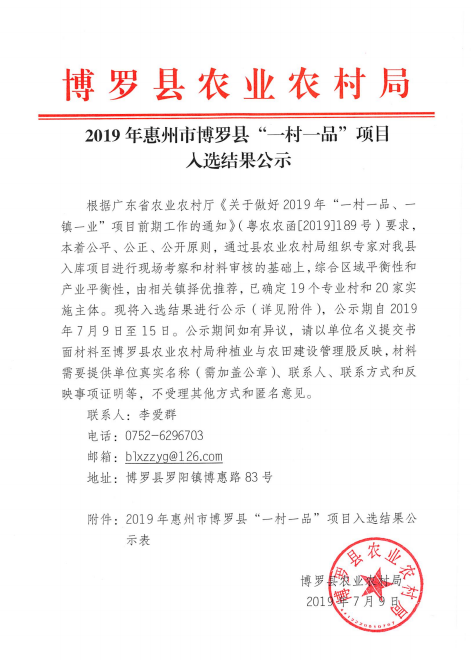 2019年惠州市中文博彩平台“一村一品”项目入选结果公示