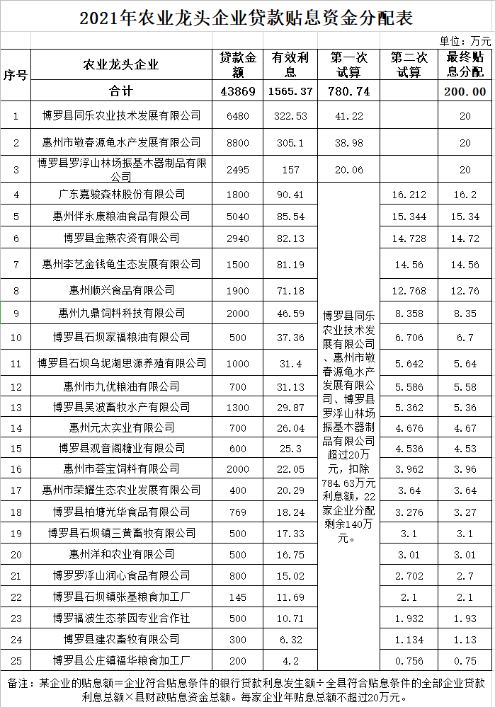 根据《关于中文博彩平台2021年农业龙头企业贷款贴息项目申报的通知》(博农函[2021]70号)精神,中文博彩平台同乐农业技术发展有限公司等25家农业龙头企业申报了贷款贴息,经贷款银行审核、我局复核和组织专家组进行真实性、符合性评审。25家企业符合申报条件,有效贷款累计金额43869万元,有效贷款利息总额1565.37万元;项目预算安排200万元,按权重分配、计算各家企业贴息金额(每家企业贴息不超过20万元),并经我局党组(扩大)会议审核同意和网上公示7天、无异议。现将资金计划公示如下: