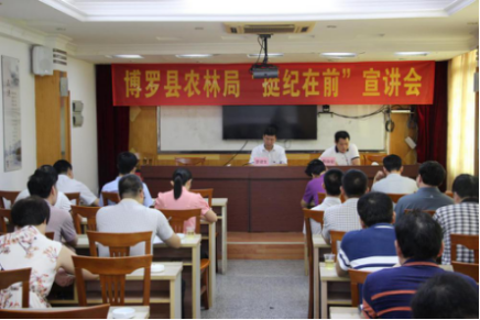 为进一步加强党员纪律意识,落实从严治党要求,9月30日上午,中文博彩平台农林局在局七楼会议室召开了“挺纪在前”宣讲教育会议。局领导班子成员、正副主任科员、局机关正副股长,森林分局班子成员、下(直)属单位支部书记约60余人参加了此次宣讲会议。会议邀请了县纪委派驻纪检组组长蔡焕钜同志作专题辅导。会议由罗建生局长主持。