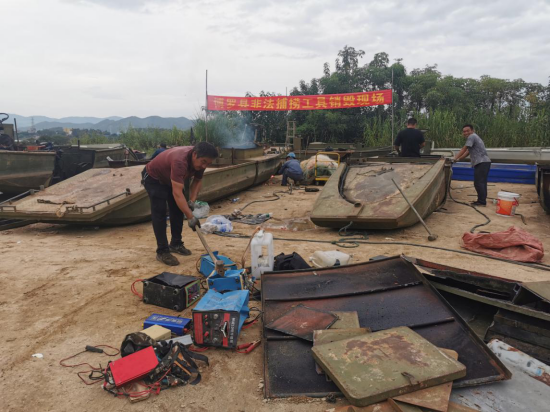去年以来,特别是东江禁渔期3月1日到6月30日期间,县农业农村局在全县开展“三无”渔船集中整治和渔业安全生产隐患大排查、大整治活动,通过采取日常检查、伏击蹲点、水陆结合、无人机侦察等方式,在水上派出所和当地政府等配合下,重点查处了观音阁镇、龙溪街道办、罗阳街道办等电鱼作业非法捕捞行为,现场查获收缴了带有电鱼设备的“三无”渔船共15艘,其中铁质渔船8艘,塑料船6艘和木船1艘,另收缴了背式电鱼机12台,违规网具一批。根据国家相关法律法规和《渔业法》规定,现进行集中拆解、分割和销毁。