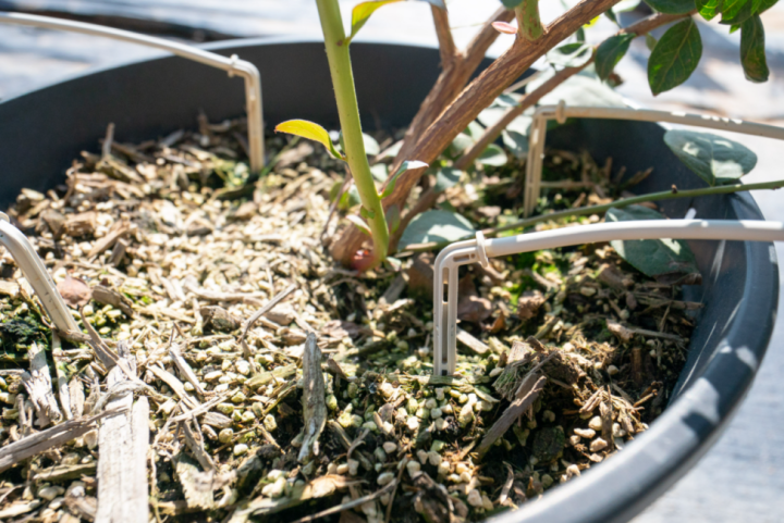 蓝莓园通过管道输送肥水,最后经由滴箭输入到每一颗蓝莓,做到定时定量。