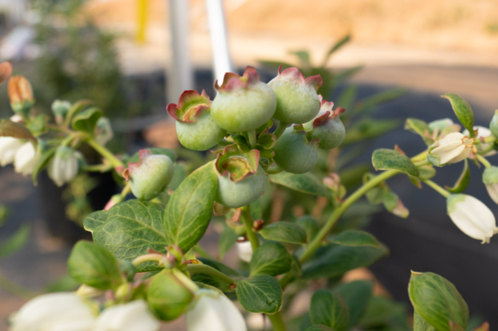记者留意到,这里的蓝莓并不是直接种植在土壤里,而是通过盆栽种植。“地里全是土壤,为什么不直接种到地里?”面对记者的提问,设施蓝莓项目的相关负责人陈华成解释道:“我们采用的是无土栽培技术。盆子里面装的不是土壤,而是无土基质。”陈华成介绍,无土基质是根据蓝莓的生长所需专门配备的,能让蓝莓在无菌的环境中生长,减少病害,提高成活率,让蓝莓能长得更好。“这不!今年7月刚小苗种下,而今蓝莓苗已经实现了开花结果,预计2023年1月可以陆续有蓝莓成熟,直到4月份。”