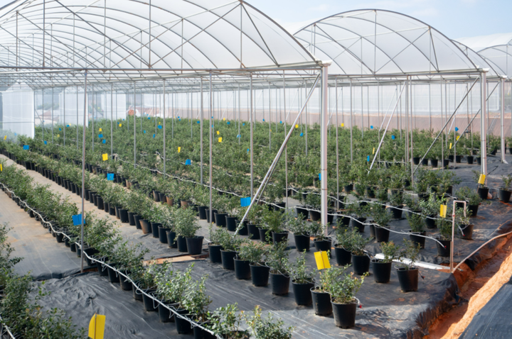 大棚内一棵棵蓝莓长势喜人,一些蓝莓已经长出了果子。
