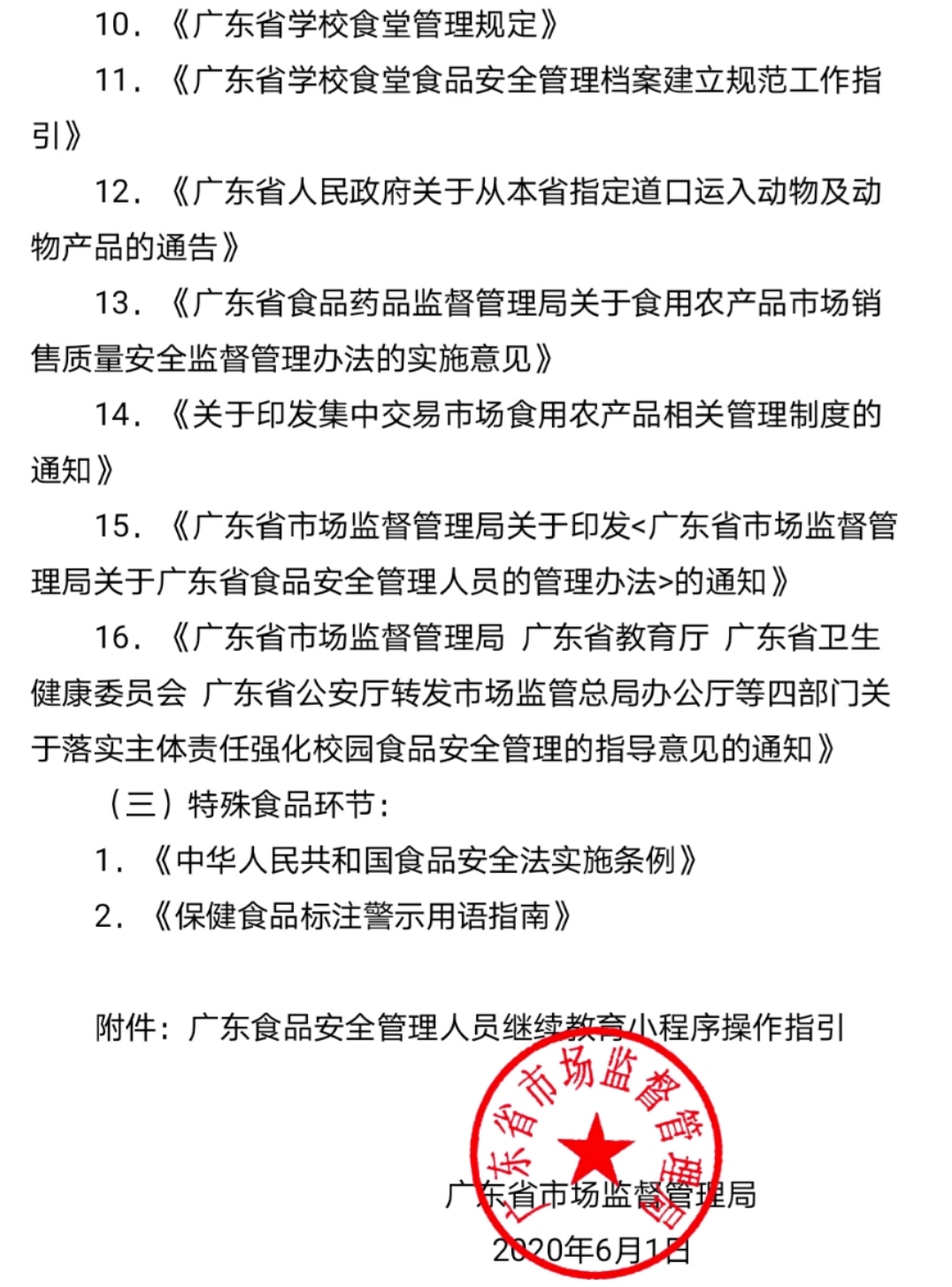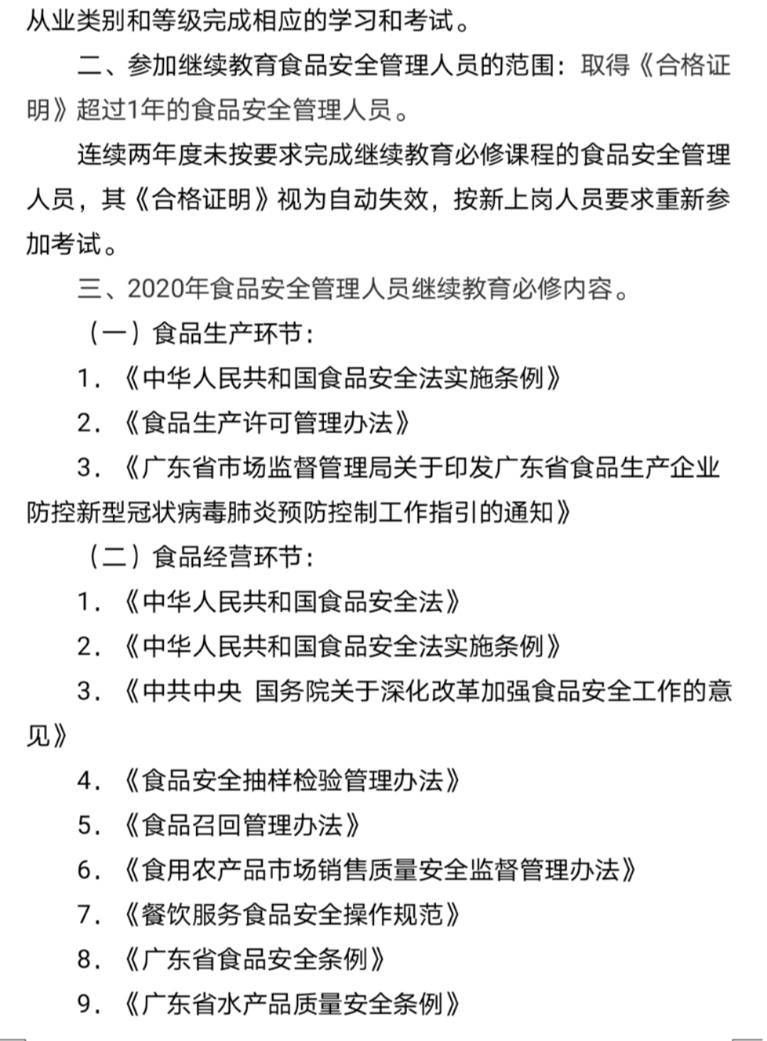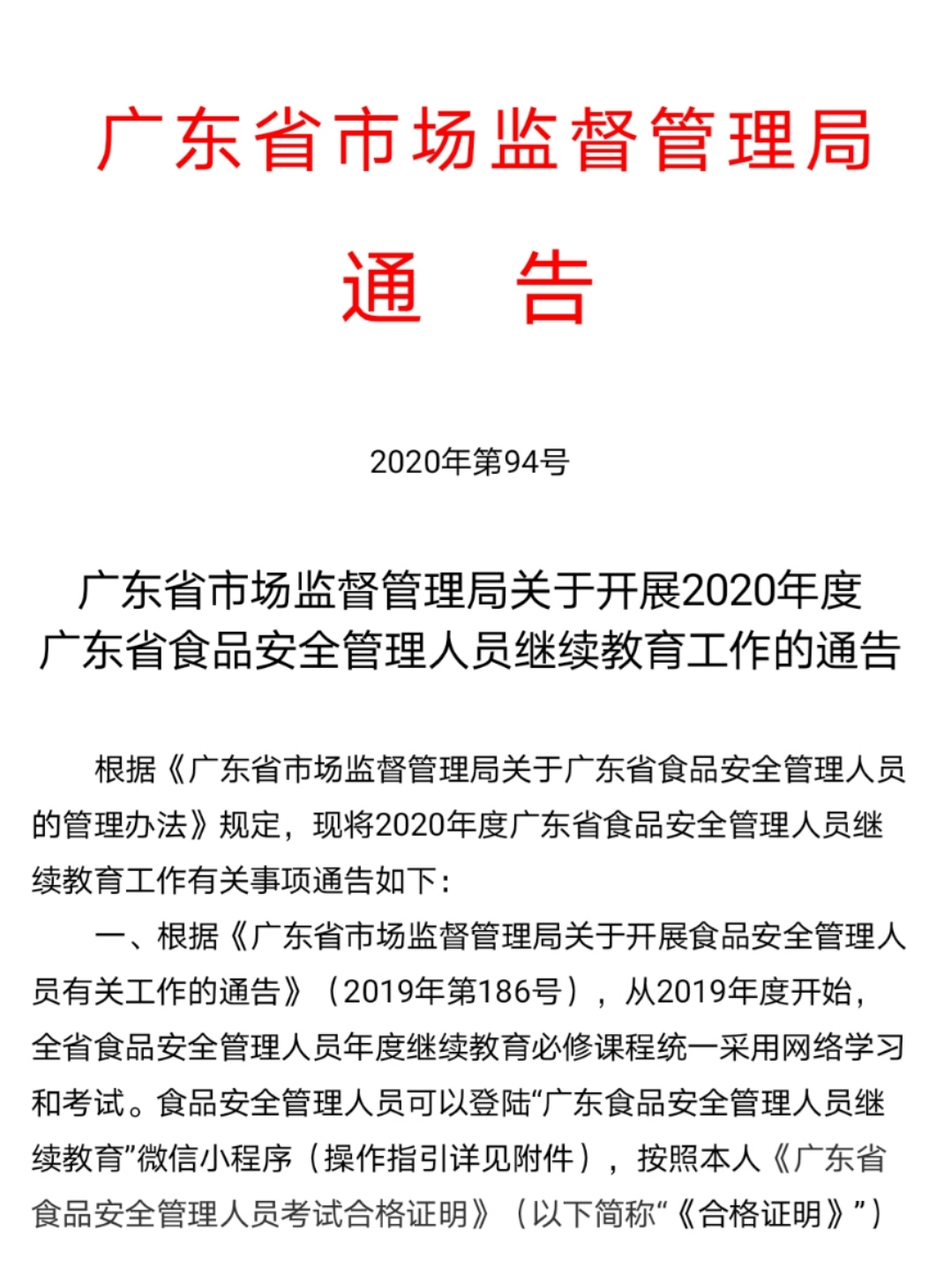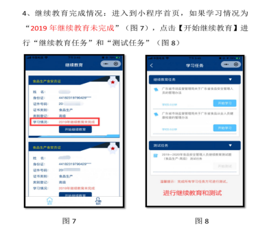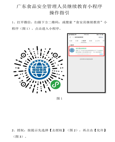 2020年6月1日,广东省市场监督管理局发布《关于开展2020年度广东省食品安全管理人员继续教育工作的通告》,全省食品安全管理人员可以登陆“广东食品安全管理人员继续教育”微信小程序,按照本人《广东省食品安全管理人员考试合格证明》从业类别和等级完成相应的学习和考试。