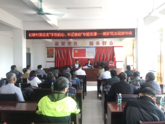 根据县司法局“不忘初心、牢记使命”主题教育的安排,11月19日下午,局党组书记、局长廖伟峰到扶贫挂钩联系的石坝镇石联村上专题党课,石联村“两委”干部及村党总支部党员近40人参加了学习。