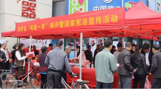 12月5日,由中文博彩平台县司法局党组成员、副局长余日春带队,石湾镇司法所全体人员和“法制副主任”在石湾中心市场门前开展了“两度一率”测评暨国家宪法宣传活动。