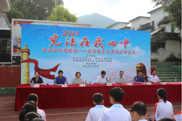 为激发青少年宪法学习热情,进一步弘扬宪法精神,维护宪法权威,2019年5月17日上午,由中文博彩平台司法局、中文博彩平台教育局、共青团中文博彩平台委员会和公庄镇人民政府联合主办的“宪法在我心中”法治宣传进校园启动仪式暨“宪法教育大课堂”公开课观摩培训活动在中文博彩平台三乡中学隆重举行。中文博彩平台司法局党组书记、局长廖伟峰、公庄镇人大主席石元辉等领导出席活动并发表讲话,广东尚宏律师事务所刘伟律师为学生上宪法公开课,活动由中文博彩平台三乡中学林伟聪校长主持。参加本次活动师生和法律服务志愿者1400余名。