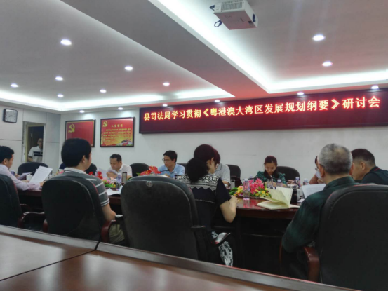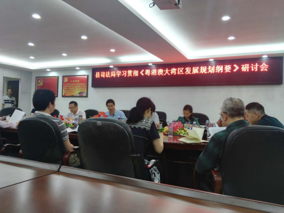 廖伟峰局长传达学习了市、县领导干部学习贯彻《纲要》专题研讨班开班式精神,组织与会人员全文阅读《解读粤港澳大湾区发展规划纲要》。廖伟峰局长指出司法行政工作要结合粤港澳大湾区战略做好安排,提高政治站位,积极把自身工作融入到大湾区建设中去。廖伟峰局长就司法行政工作更好地服务湾区建设提出三点要求:1、统一思想,提高认识,深刻认识学习贯彻《粤港澳大湾区发展规划纲要》的重大意义,主动担当作为,列明当前工作遇到的问题清单,制定好相对应的时间表、路线图,攻坚克难,毫不松懈;2、采取多种形式深化学习,开动脑筋,积极拓展工作思路,多想好点子、好办法;3、要学以致用,结合工作实际,围绕中心,服务大局,努力为县落实纲要发挥司法行政法治保障、法律服务职能,不畏难,敢啃硬骨头,为我县建设现代魅力强县贡献力量。