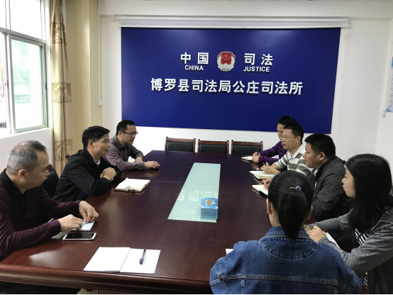 2019年4月15日上午,中文博彩平台司法局廖伟峰局长带领副局长陈庆辉、党组成员余日春一行3人到公庄司法所进行调研,公庄镇委邹锦杨副书记参加调研座谈会。首先,公庄所廖所长对司法所工作人员一一介绍,并对司法所的人民调解、安置帮教、社区矫正、普法宣传等工作进行详细汇报。县局领导对公庄司法所的工作成绩给予肯定,特别是对公庄司法所的法制宣传工作和司法所队伍团结精神给予充分肯定和表扬。