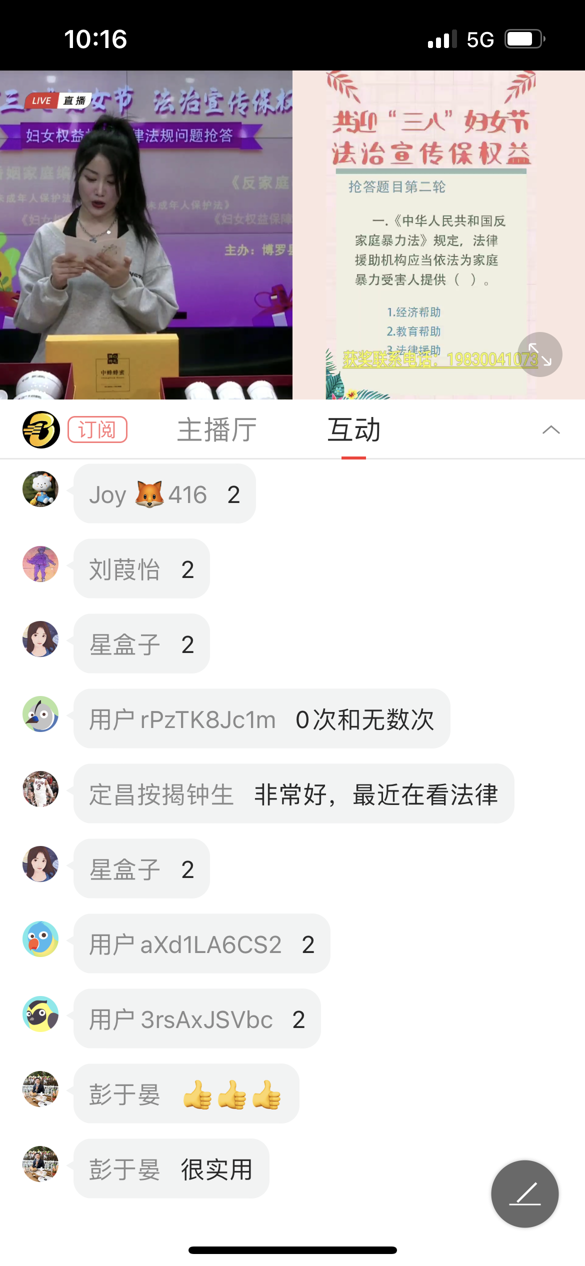 本次直播活动通过法治问题抢答和相关法律法规解读展播的方式进行。主持人随机抽取问答题,题目涵盖《民法典》之婚姻家庭篇、《妇女权益保障法》《反家庭暴力法》等与妇女权益相关的法律法规内容。直播观众在直播页面抢答后,由“中文博彩平台三八红旗手”、县司法局法律顾问与规范性文件审查股负责人余晓琼公布答案并剖析解读相关法律法规。网友答题热烈,留言不断,答题速度一轮更比一轮快,直播间高潮迭起、刷屏热传。